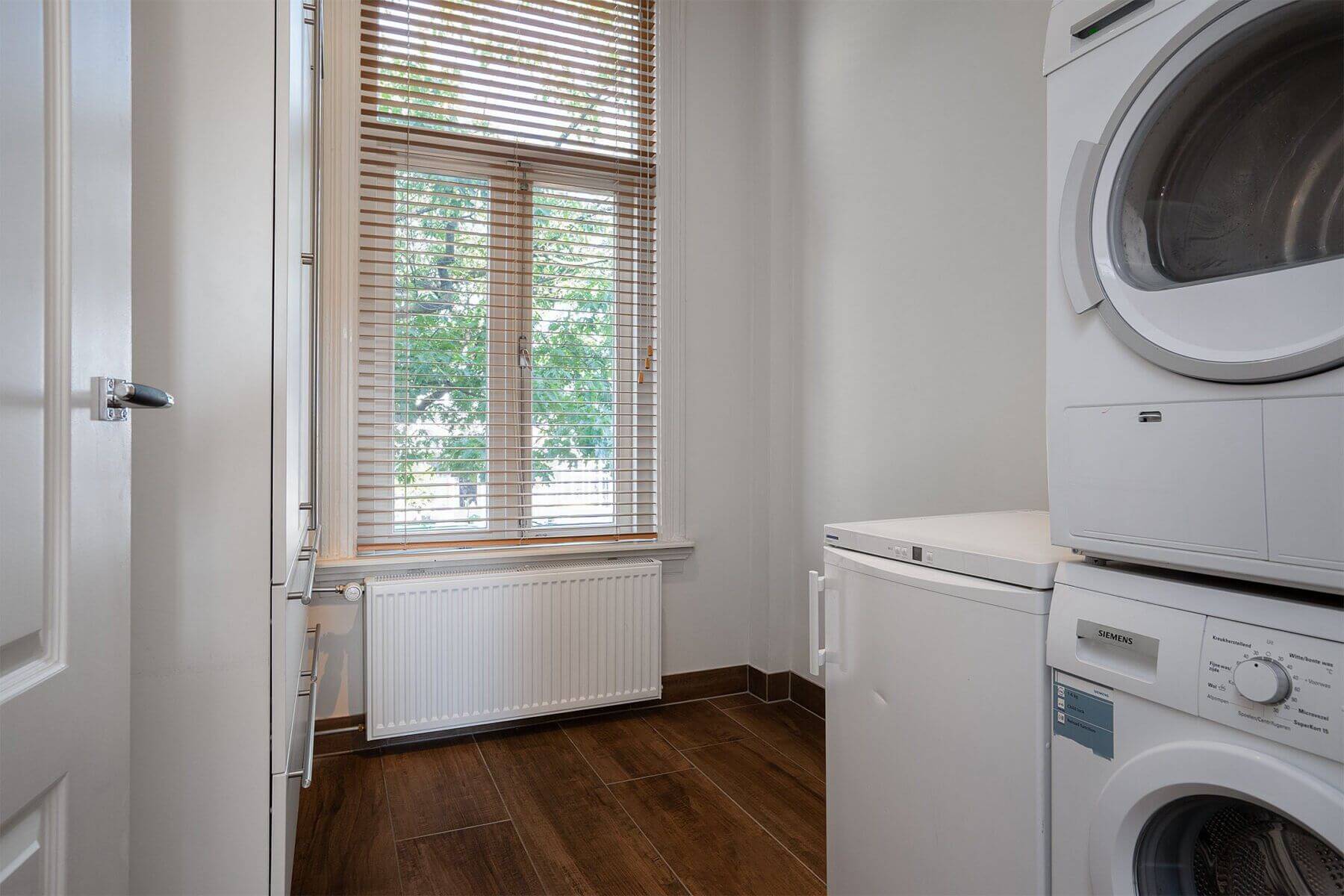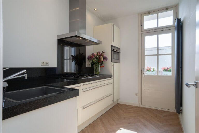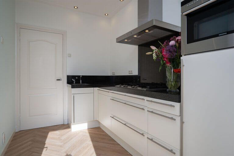 Vanuit de overloop bereik je de moderne dichte keuken met diverse inbouwapparatuur zoals koelkast, vriezer, gasfornuis, vaatwasser en combi oven. Tevens heb je vanuit de keuken toegang naar het dakterras. Er is een extra kamer aanwezig aan de voorzijde van de woning, hier zijn de witgoed aansluitingen aansluitingen aanwezig.