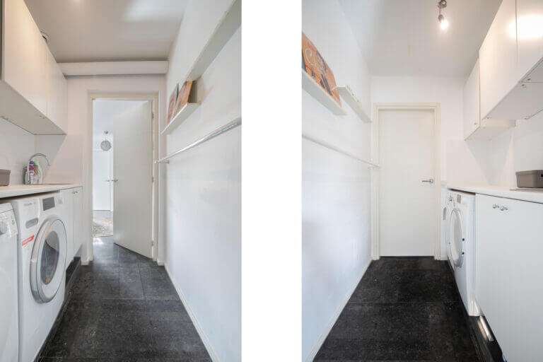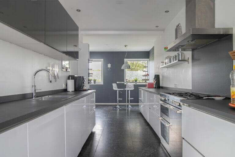 Entree, apart toilet. Ruime woonkamer, eetkamer en half-open keuken. De keuken is voorzien van maar liefst 3 ovens, combimagnetron, Quooker, 2 koelkasten, vaatwasser, 5-pits kookplaat en afzuigkap. Ook is er een eetbar. Aan de keuken grenst één van de twee bijkeukens. Naast dat er voldoende ruimte is om op te bergen, is deze bijkeuken voorzien van grote vriezer. In de andere bijkeuken zijn de wasmachine en droger te vinden.