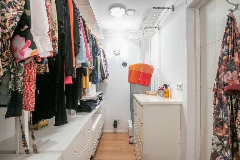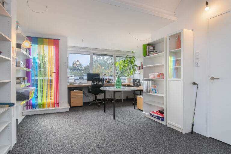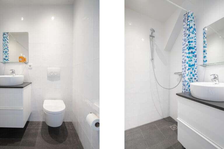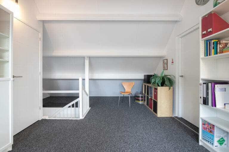 Op de eerste verdieping is de tweede slaapkamer, groot thuiskantoor – ingericht voor 2 personen en de tweede badkamer. Deze badkamer is voorzien van inloopdouche, wastafel en toilet.