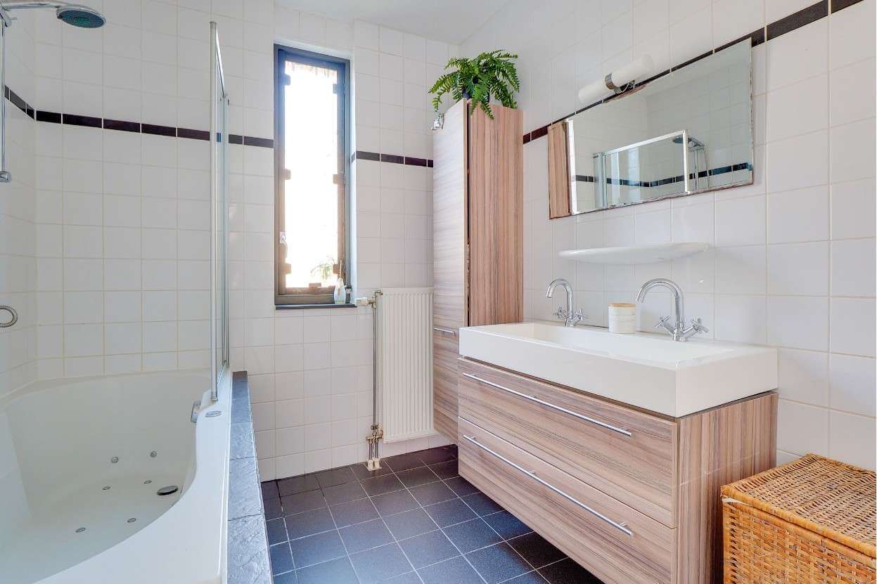 Via de woonkamer zijn de twee slaapkamers te bereiken. De kleinste slaapkamer bevindt zich aan de zijkant van de woning en kan worden ingericht als studeer-, logeer- of kinderkamer. De grote slaapkamer grenst aan de achtertuin en bevat een en-suite badkamer, voorzien van een bubbelbad, douche en ruim wastafelmeubel,