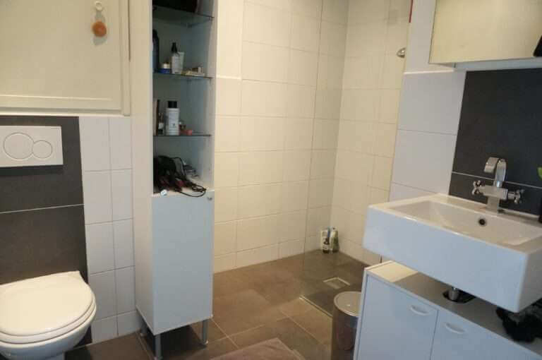 De luxe badkamer heeft een vloerverwarming, ingebouwde radio en aparte douche.