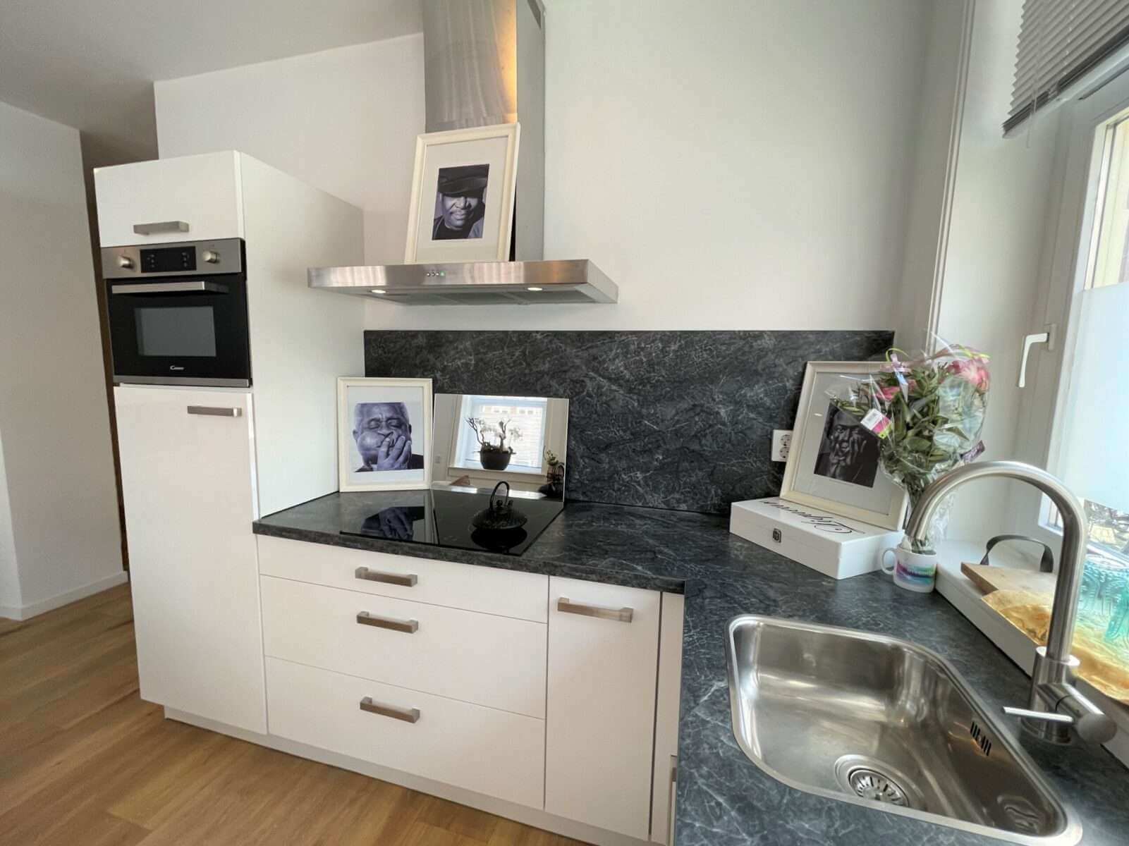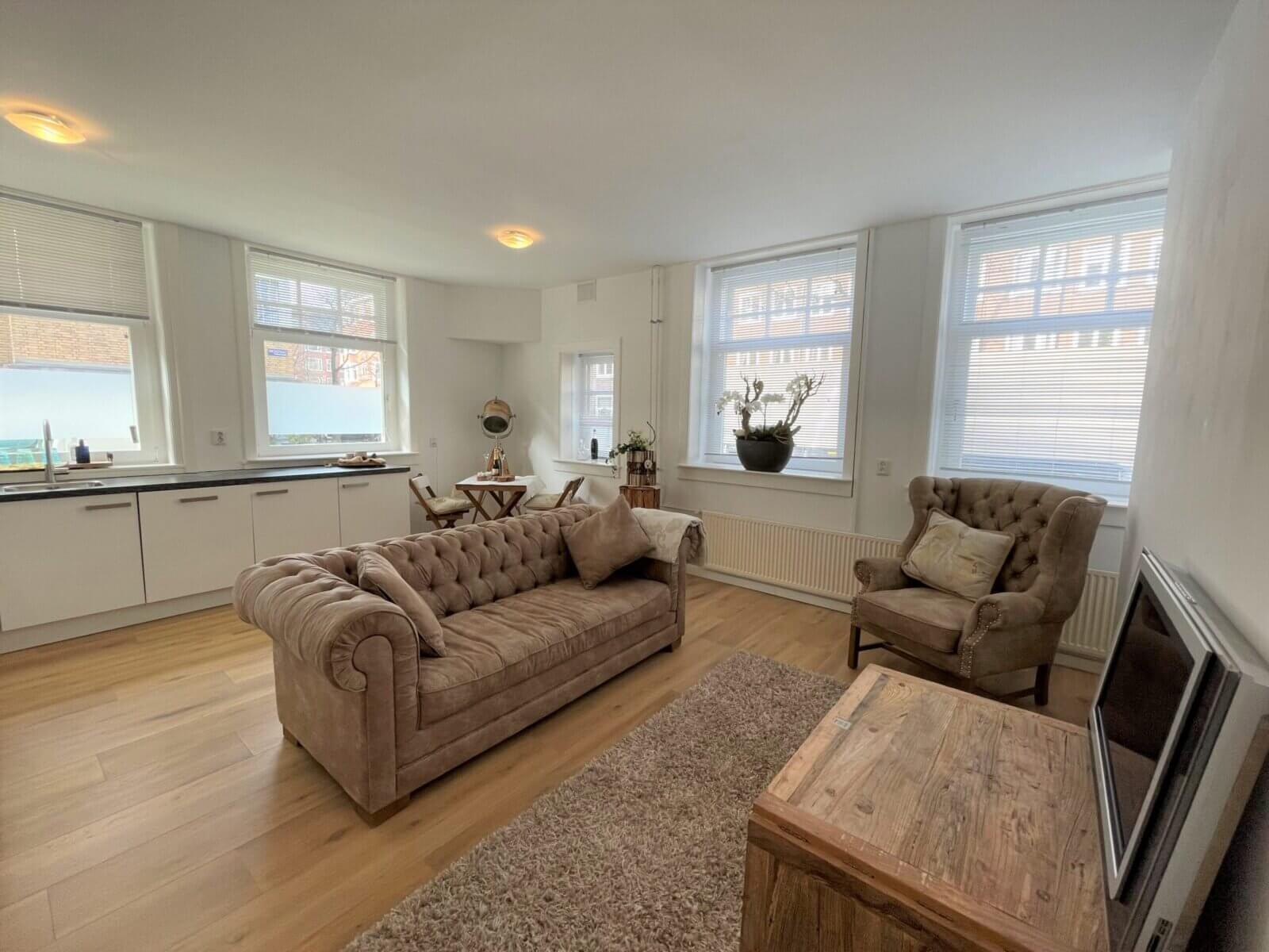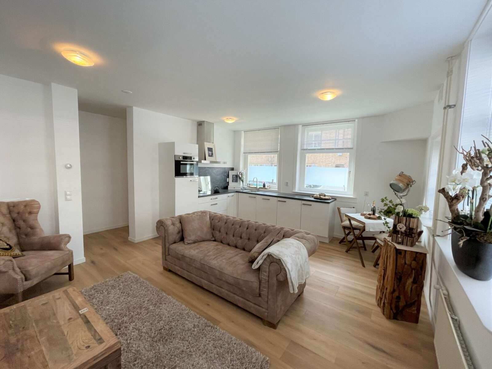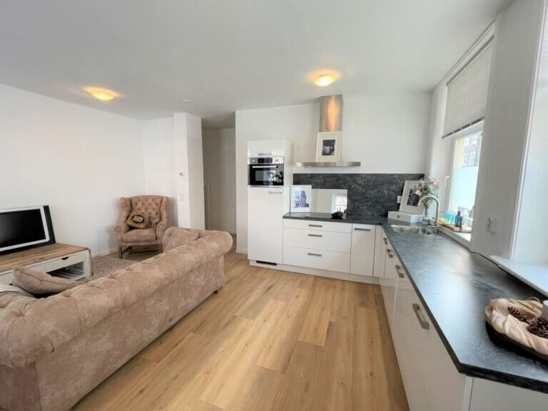 De sfeervolle en lichte woonkamer grenst aan de open hoekkeuken, welke is voorzien van een combi-oven, een vaatwasser, ingebouwde koel-vriescombinatie en een inductiekookplaat met afzuigkap.