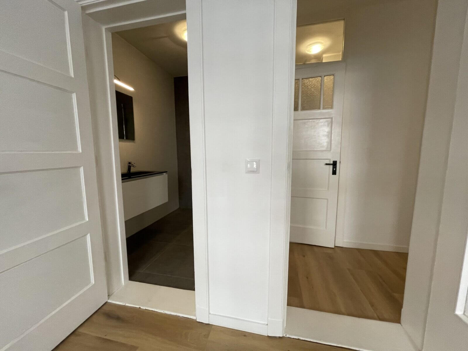 In de gang bevinden zich ook het aparte toilet, diverse ingebouwde opbergkasten en een aparte ruimte met de wasmachineaansluiting.