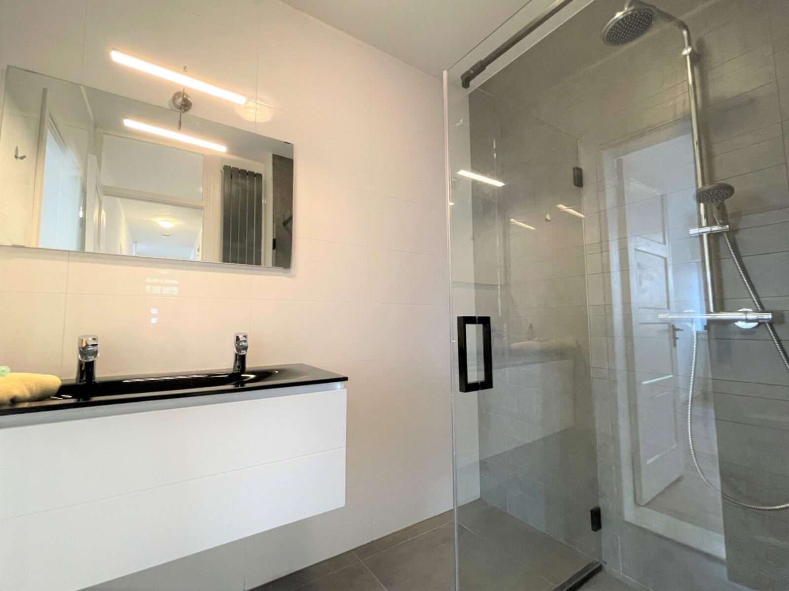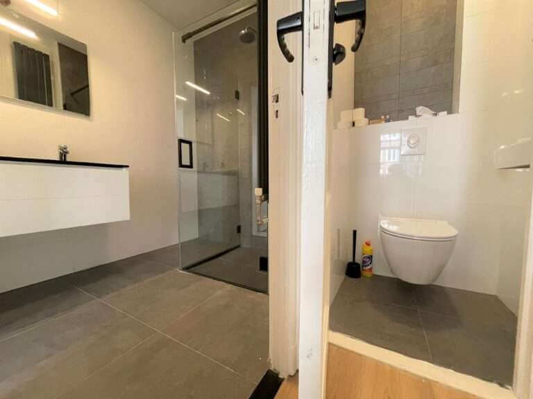 De badkamer grenst aan de master slaapkamer en is ook vanuit de hal te bereiken, is zeer modern ingericht met een dubbele wastafel en een ruime inloopdouche.