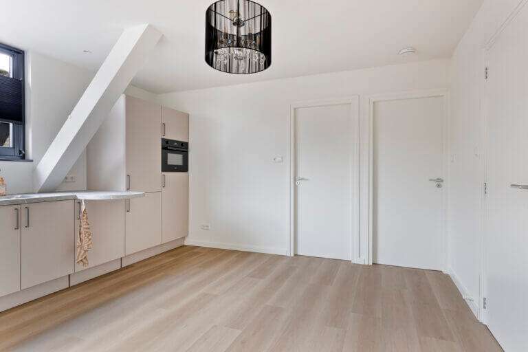 De speelse woonkamer ligt aan de voorzijde van het appartement en biedt vele indelingsmogelijkheden. Vanuit de woonkamer heb je direct toegang tot de grote en lichte leefkeuken, wat het hart van dit appartement is. De ruim opgezette keuken beschikt o.a. over een koel-vries combinatie, inductie kookplaat met plaatafzuiging en een vaatwasser. Vanuit de keuken zijn beide slaapkamers en de badkamer bereikbaar. De badkamer beschikt over een wastafel meubel, een inloopdouche en een hangtoilet.