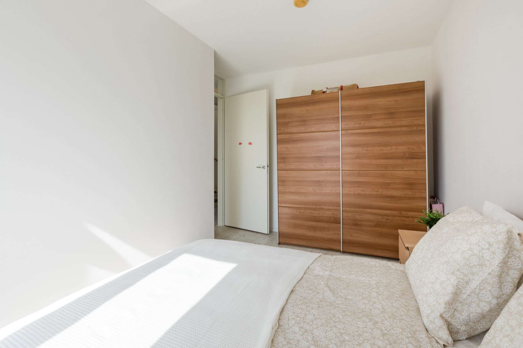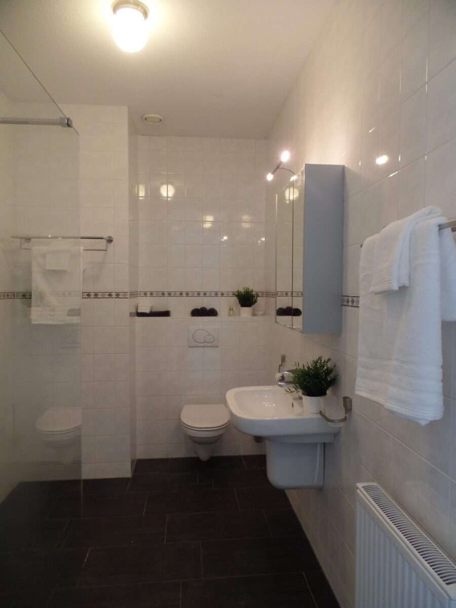 De badkamer is geheel modern wit betegeld en is voorzien van een zwevend closet, een strak wastafelmeubel met spiegel wandkast en een ruime inloopdouche met regendouche, handdouche en brede drainafvoer. De gehele verdieping is voorzien van een mooie lichte laminaatvloer. Vanaf de overloop bereikt u via een vaste trap de tweede verdieping.