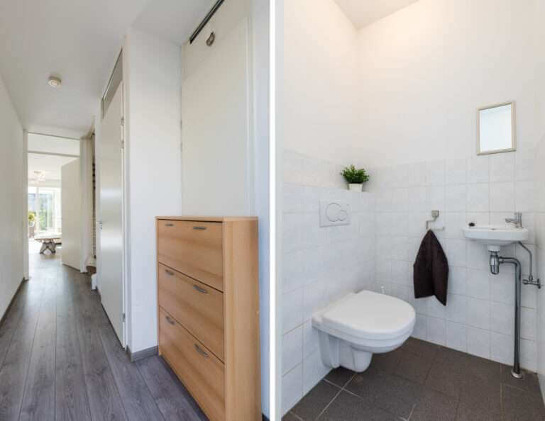 Vanuit de living is een kleine hal bereikbaar, van waaruit het toilet en de trap naar de eerste verdieping te vinden zijn. Het luxe toilet is netjes betegeld en voorzien van een zwevend closet en een fonteintje.