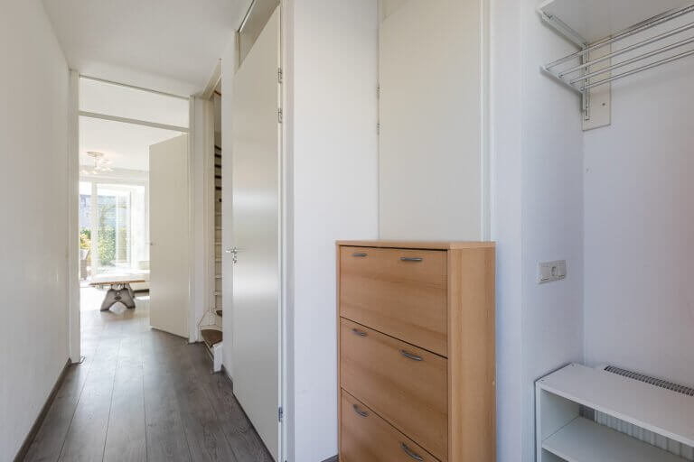 Entree van de woning, waar we, eenmaal binnen,via de hal met garderobe en meterkast in de living komen.