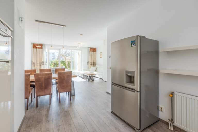 Deze living is opgedeeld in een tuingerichte woonkamer, een gezellige eethoek en een luxe keuken aan de voorzijde. In de living bevindt zich tevens de deur naar een ruime bergkast.