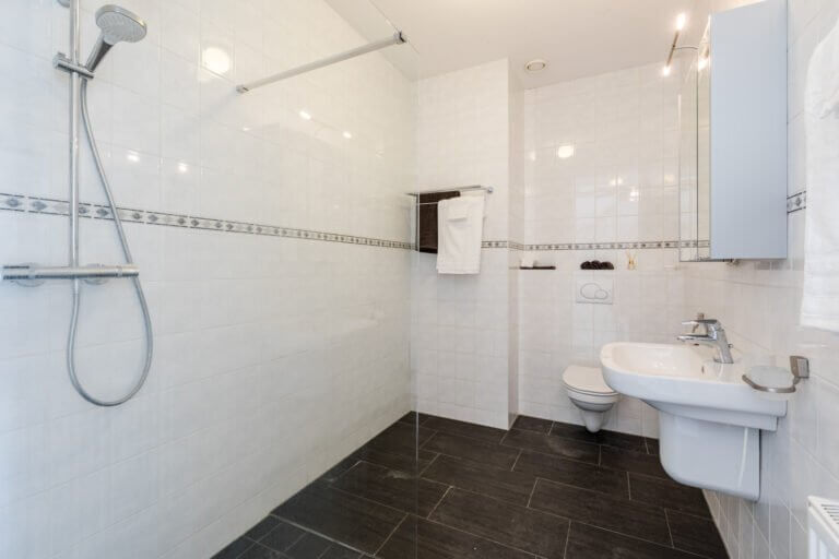 De badkamer is geheel modern wit betegeld en is voorzien van een zwevend closet, een strak wastafelmeubel met spiegel wandkast en een ruime inloopdouche met regendouche, handdouche en brede drainafvoer. De gehele verdieping is voorzien van een mooie lichte laminaatvloer. Vanaf de overloop bereikt u via een vaste trap de tweede verdieping.