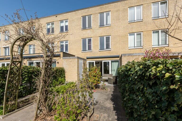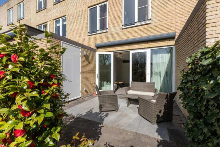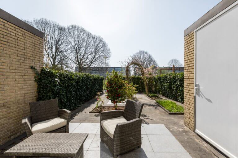 De grote raampartij met schuifpui in de woonkamer maakt de living bijzonder licht en geeft een zeer ruimtelijk gevoel. Via de schuifpui bereikt u de keurig verzorgde, zonnige achtertuin op het Zuiden. De tuin biedt genoeg ruimte voor een gezellige zithoek en is verder ruim voorzien van mooie beplanting.