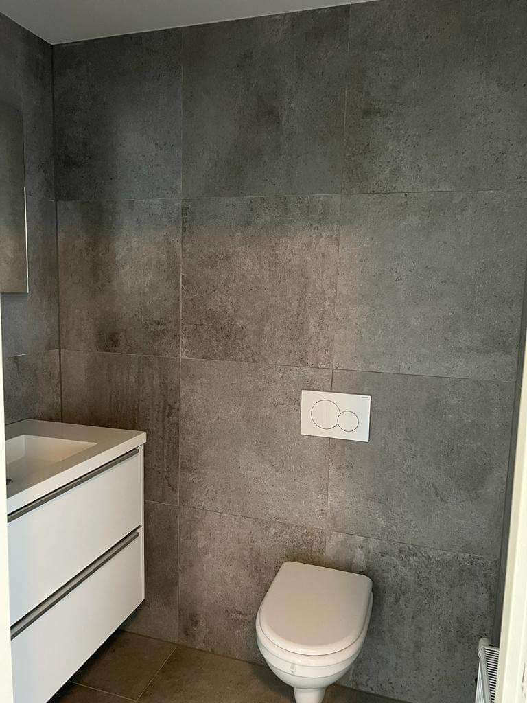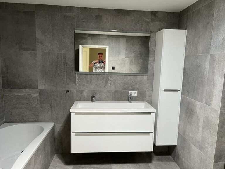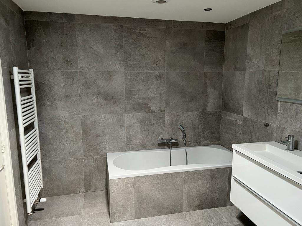 Ruime overloop die toegang biet tot 4 ruime slaapkamers en de badkamer met ligbad, dubbele wastafel met wastafelmeubel, 2e toilet en aansluiting voor de wasmachine en droger.