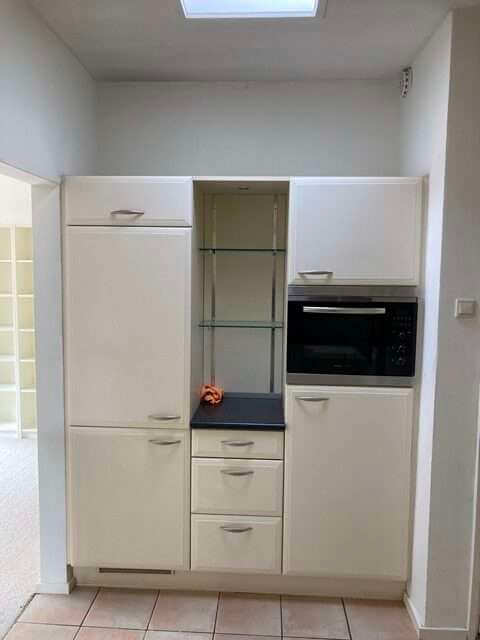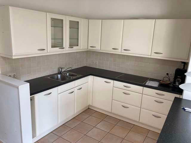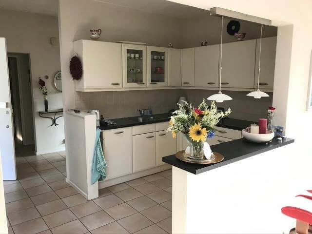 De semi open keuken is ruim voorzien van inbouwapparatuur, te weten: keramische kookplaat, afzuigkap, koelkast, aparte vriezer, vaatwasser en een ingebouwde combi-magnetronoven.