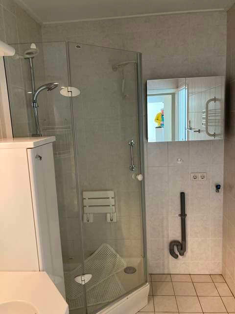 Badkamer met mooie glazen douchecabine, toilet en luxe badkamermeubel.