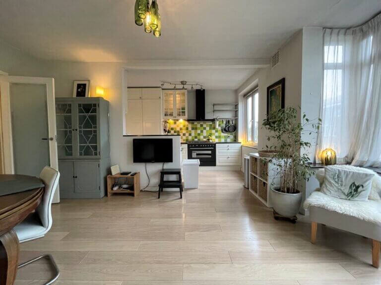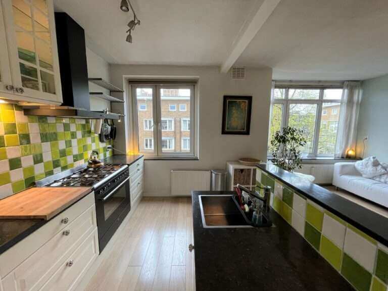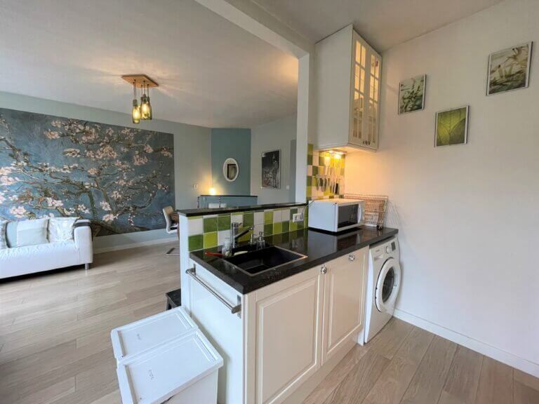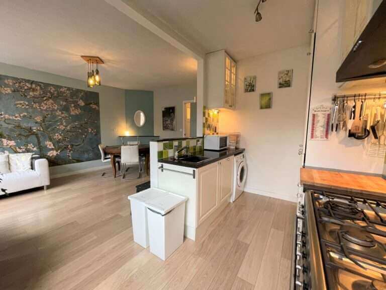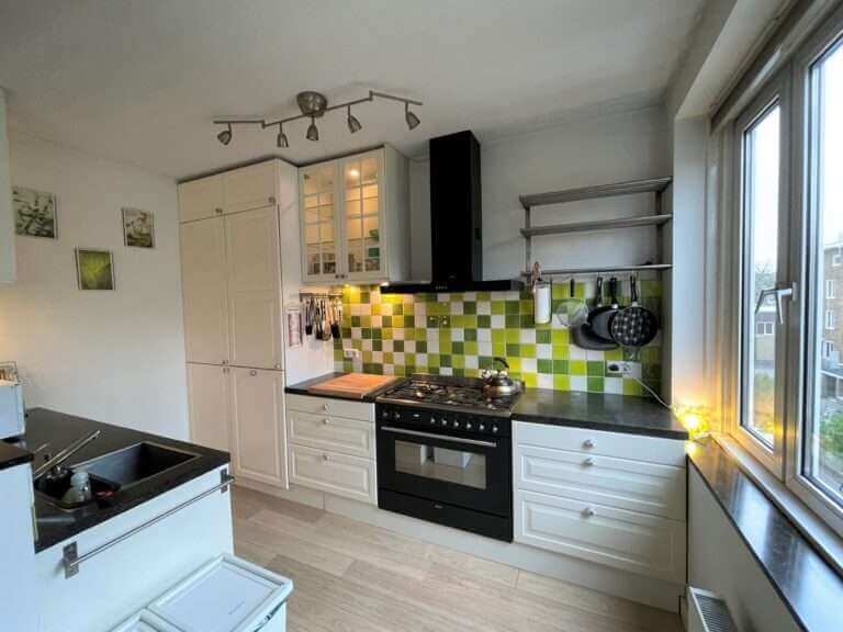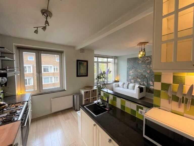 Vanaf de bank in de trendy ingerichte woonkamer (gelegen aan de voorzijde) kun je vanuit deze bovenwoning direct uitkijken over de straat. Aan de woonkamer grenst de halfopen keuken. Deze is voorzien van 6-pits fornuis met afzuigkap, combi oven, koelkast met vriezer, vaatwasser en een heleboel opbergruimte. Ook vind je hier de wasmachine.