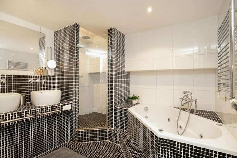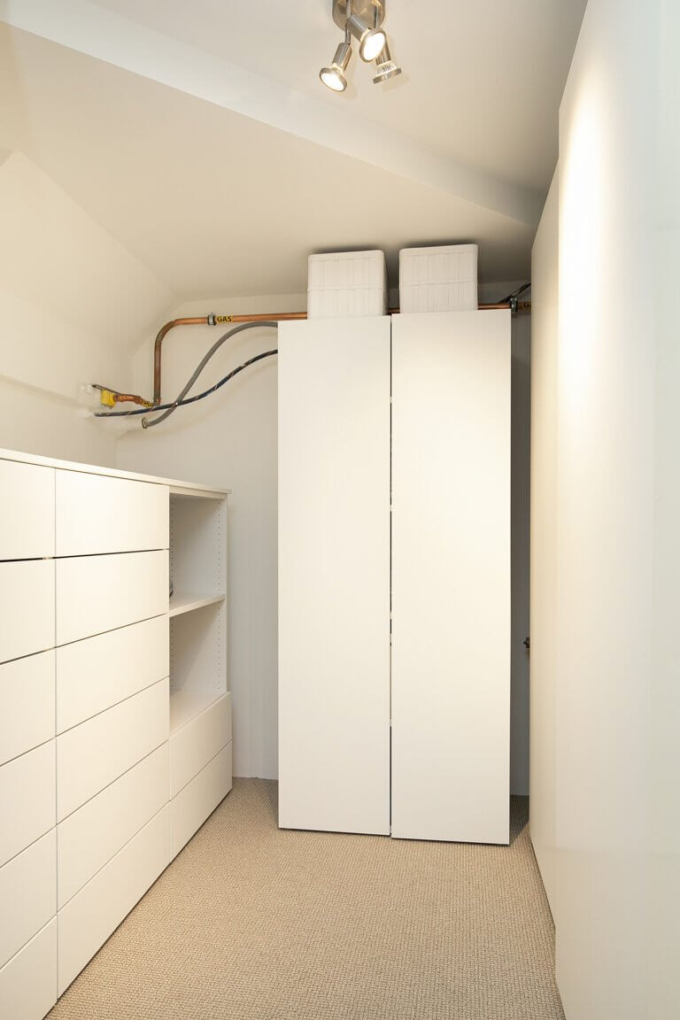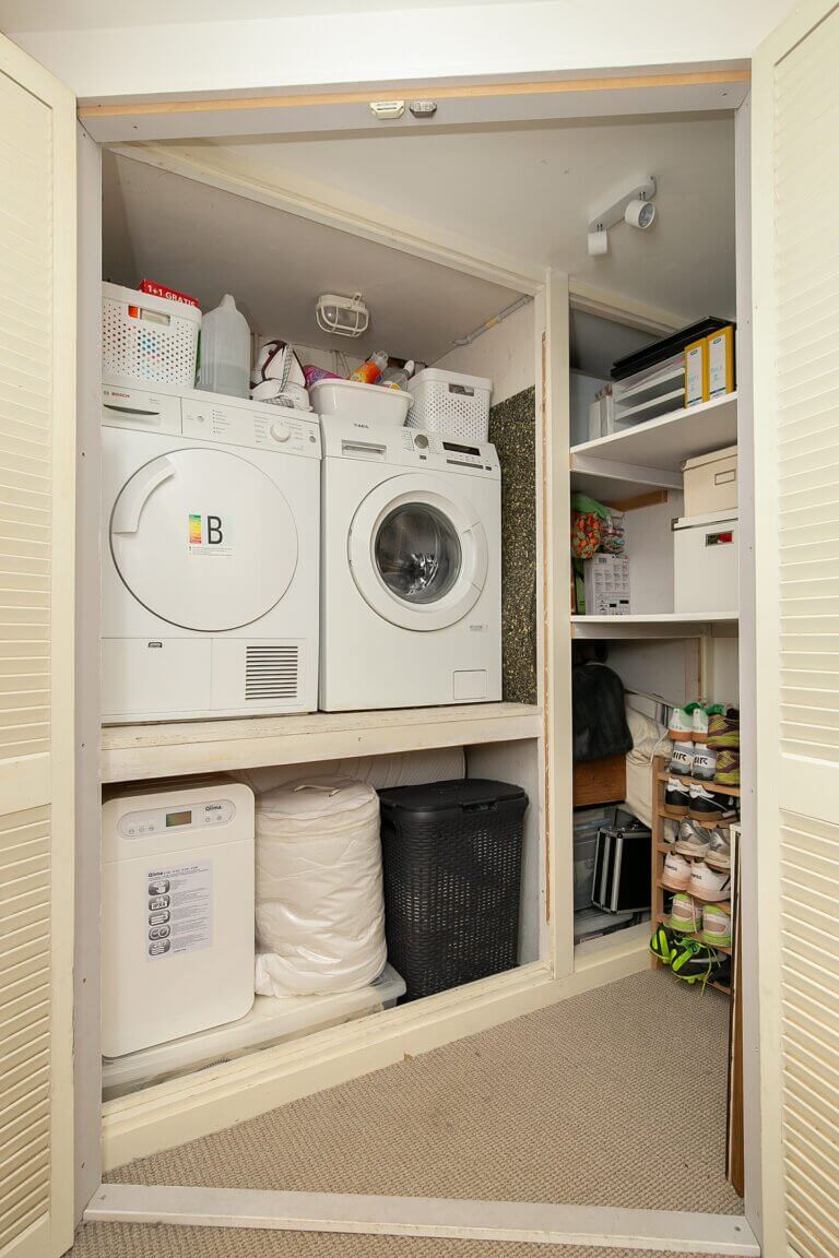 Verder is er een badkamer met ligbad, inloopdouche, dubbele wastafel en een aparte ruimte voor de wasmachine, droger en opslag.