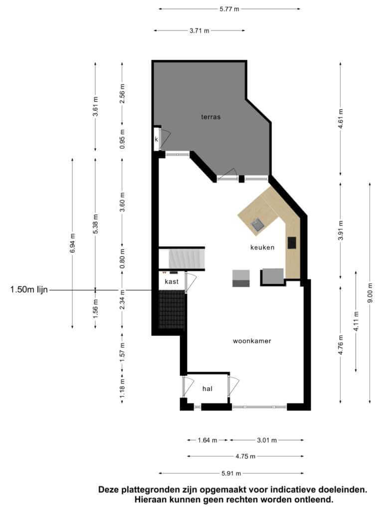 De bankirai hard houten patio ligt aansluitend aan de keuken en hier bevindt zich ook een opbergkast.