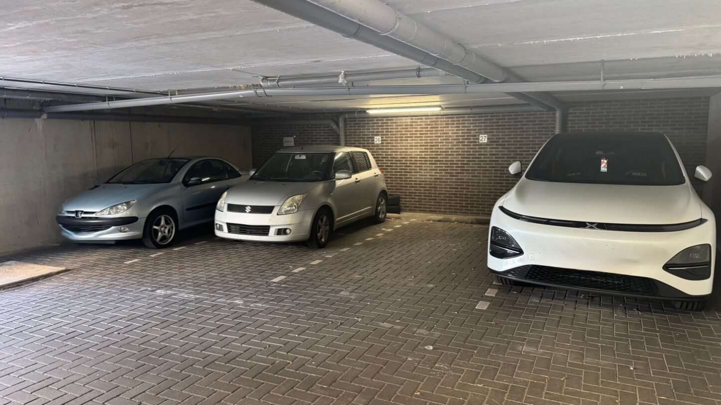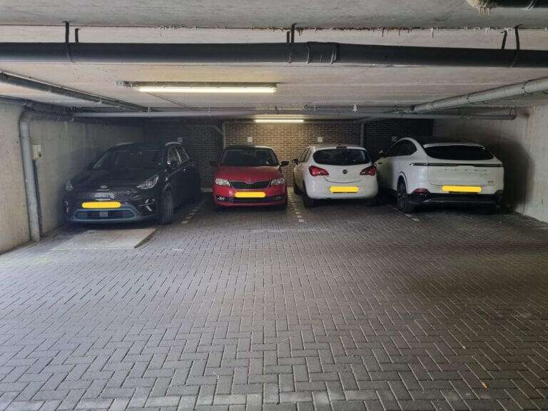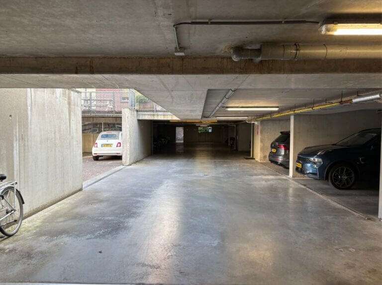 De parkeerplaats bevindt zich in een afgesloten parkeergarage, toegang via een elektrisch bedienbaar rolluik met afstandsbediening. De garage is overzichtelijk opgezet en voorzien van voldoende manoeuvreerruimte.