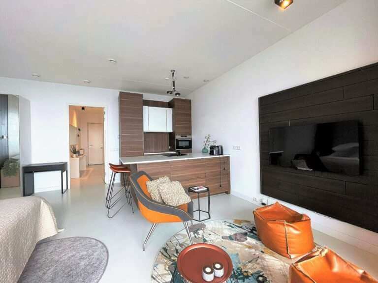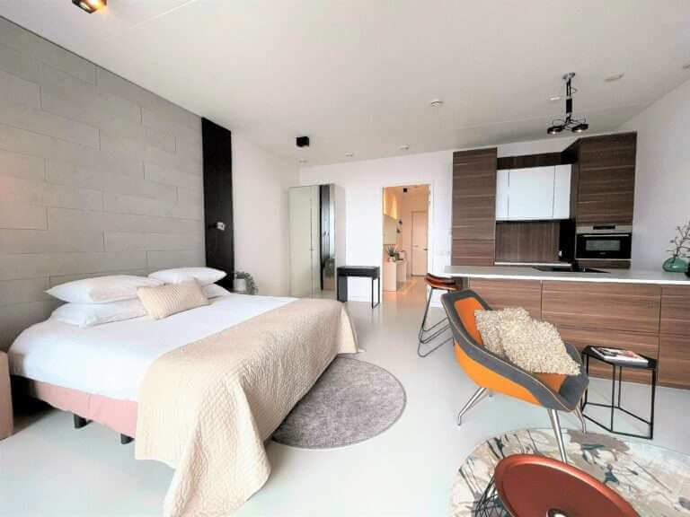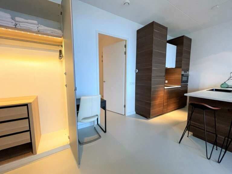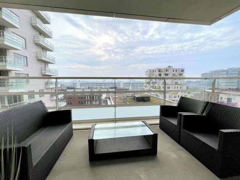 Schitterende studio van 50m2,, gelegen op de 8e verdieping van het “Intermezzo” gebouw, met een ruim terras op het zuiden.
