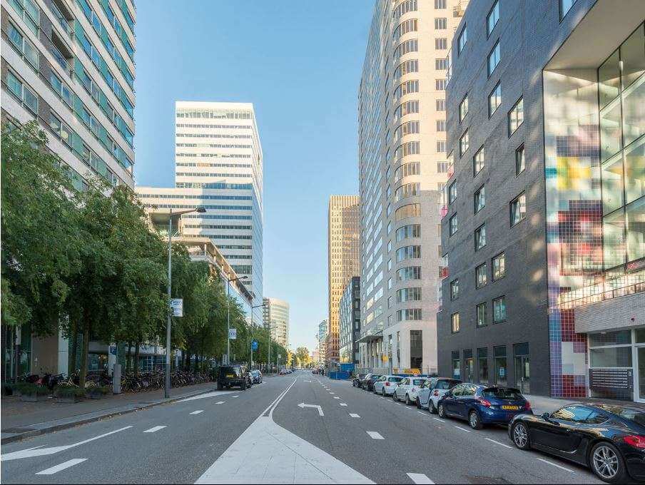 Op korte loopafstand bevindt zich station Zuid/WTC met haar trein, tram, metro, Noord-Zuid lijn en busverbindingen. U arriveert na 6 minuten met de trein op Schiphol.