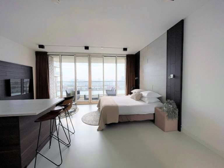De prachtige studio is een rustige oase in het hart van het stadsleven en gevuld met veel natuurlijk licht dankzij ramen van vloer tot plafond.