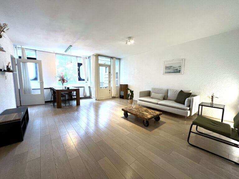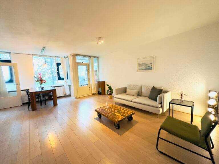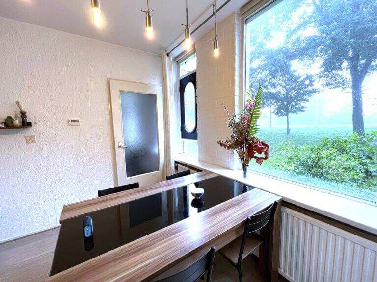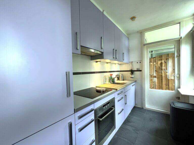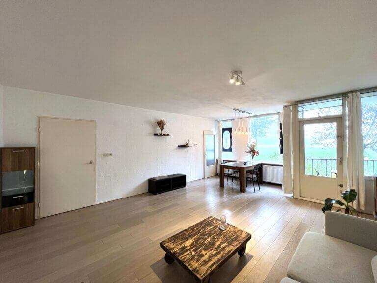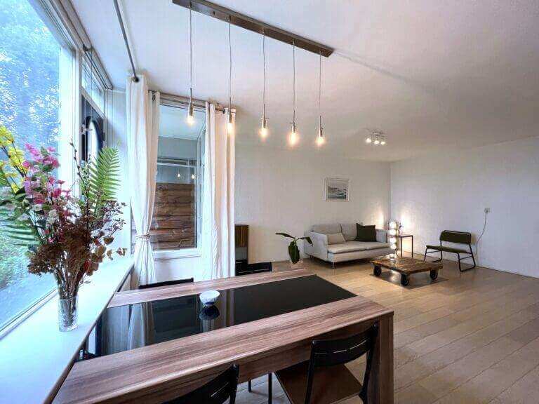 Dit fijne appartement beschikt over een zeer ruime woonkamer met eetgedeelte van 30 m2. De keuken is voorzien van moderne inbouw keukenapparatuur, zoals een vaatwasmachine, koelkast en oven. Door de vele ramen (10 meter aan ramen) – met vrij uitzicht op tuinen en bomen – is dit een lichte woning.