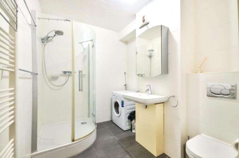 De badkamer is voorzien van een douche, wastafel en zwevend toilet.