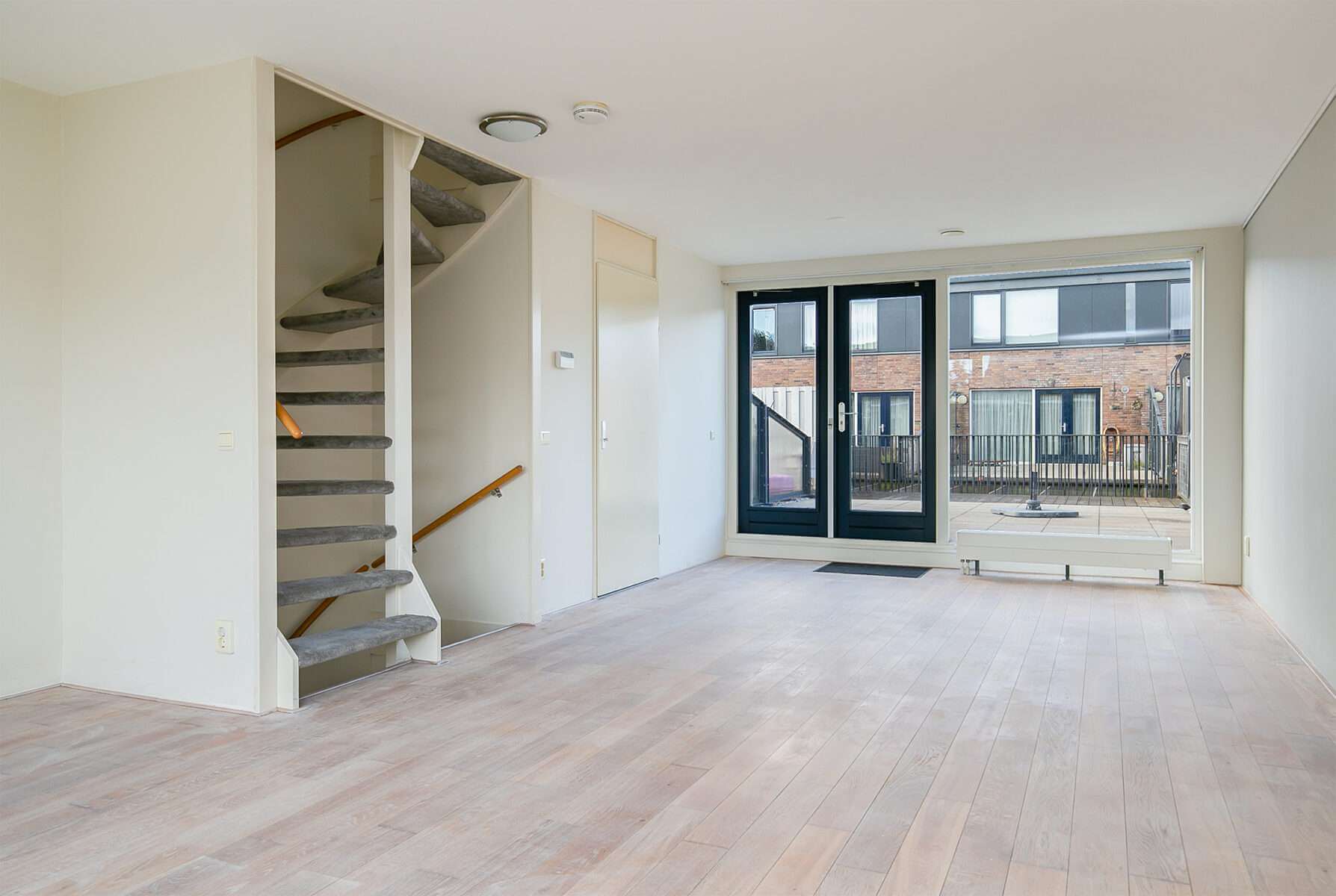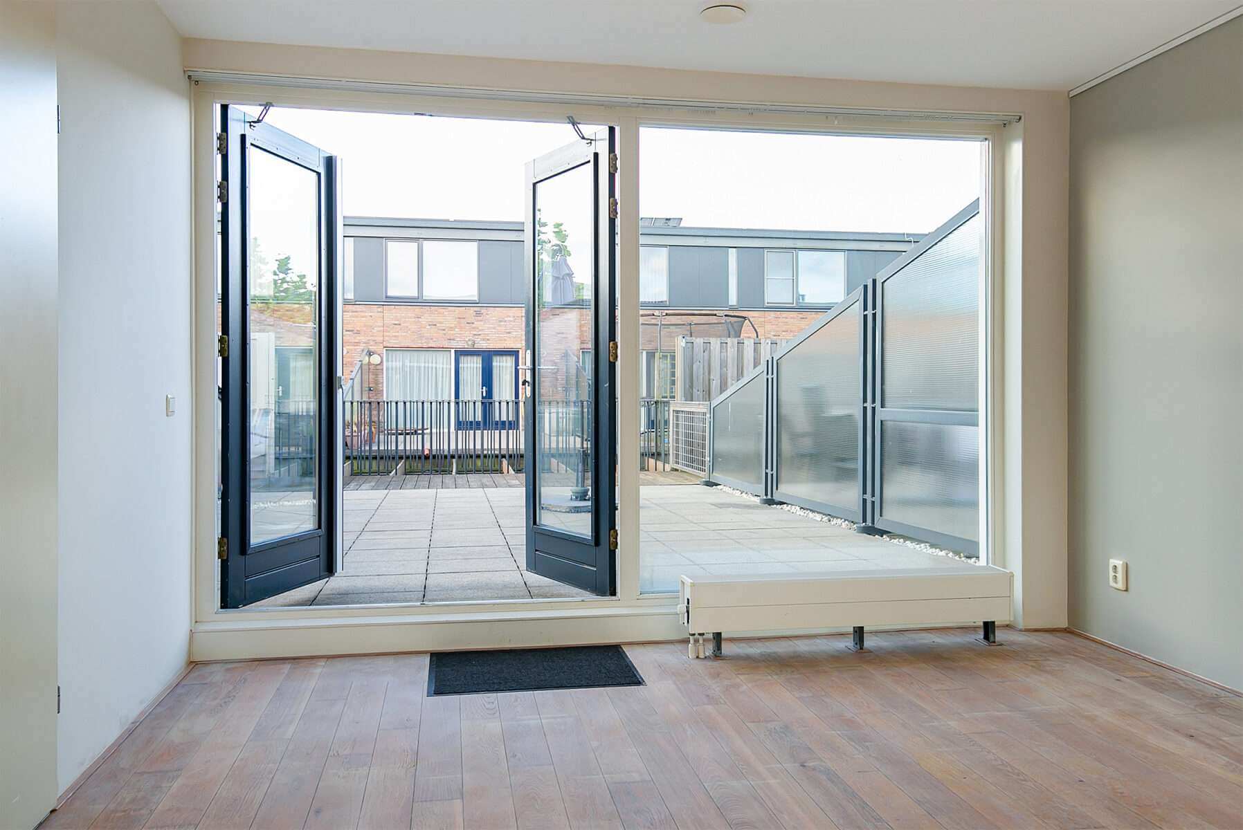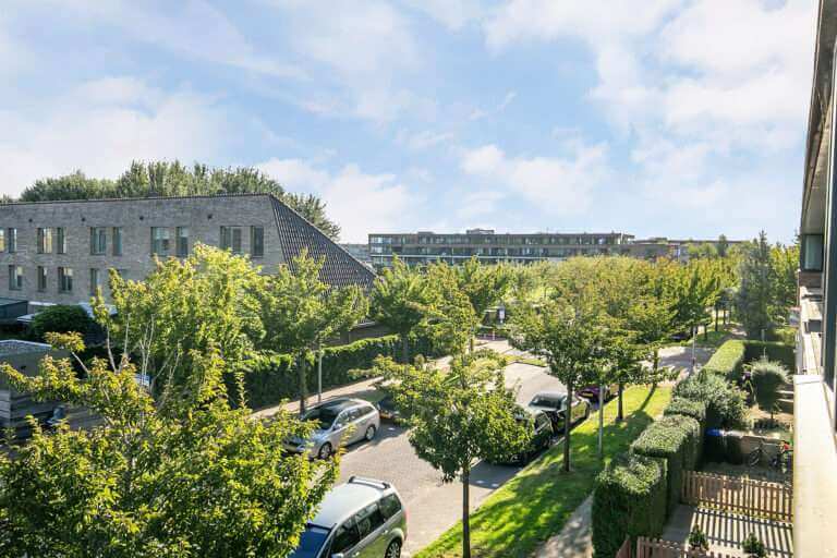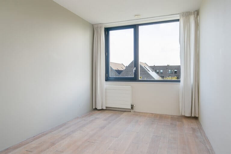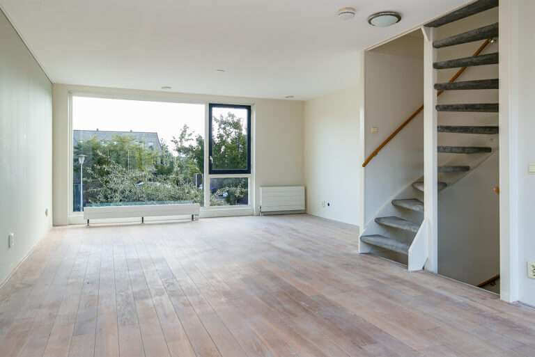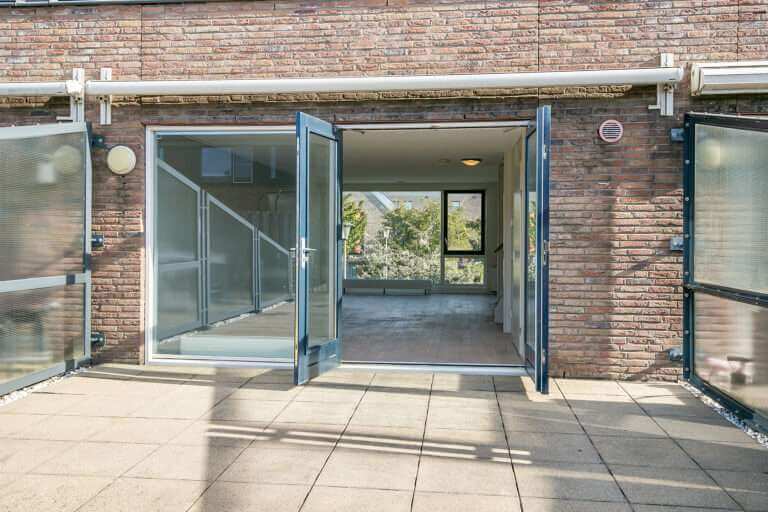 Vanuit de keuken bereikt u via een open trap de woonkamer op de 1e verdieping. De woonkamer is voorzien van een fraaie, recent gerenoveerde whitewash eiken parketvloer. Door de vele raampartijen is het een heerlijke lichte woonkamer met openslaande deuren naar het zeer ruime dakterras (ca. 42m²) aan de achterzijde met een elektrisch bedienbaar zonnescherm over de gehele breedte.