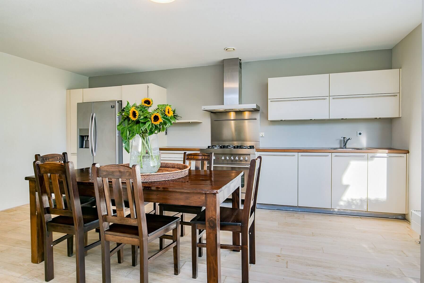 Bij binnenkomst van de woning komt u direct in de zeer ruime gezellige woonkeuken met voorzieningen als een vaatwasser, Amerikaanse koelvries-combinatie, grote oven, 6-pits gaskookplaat, afzuigkap.