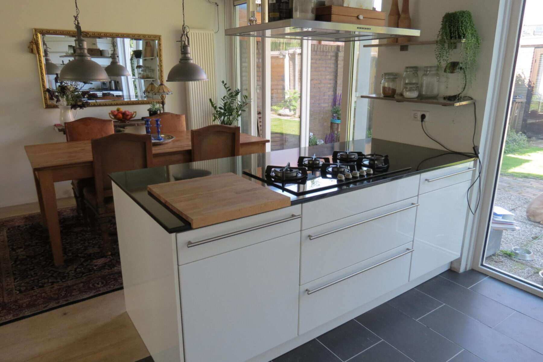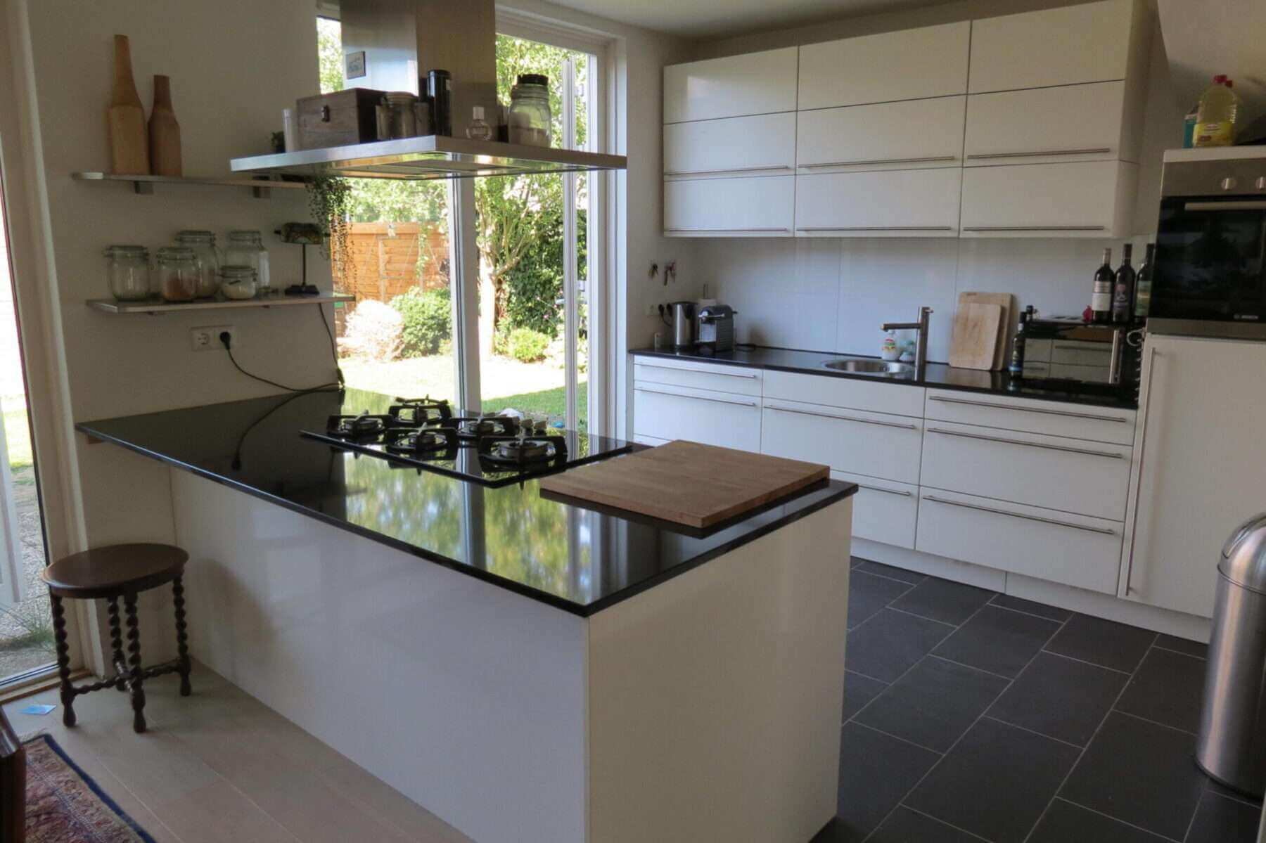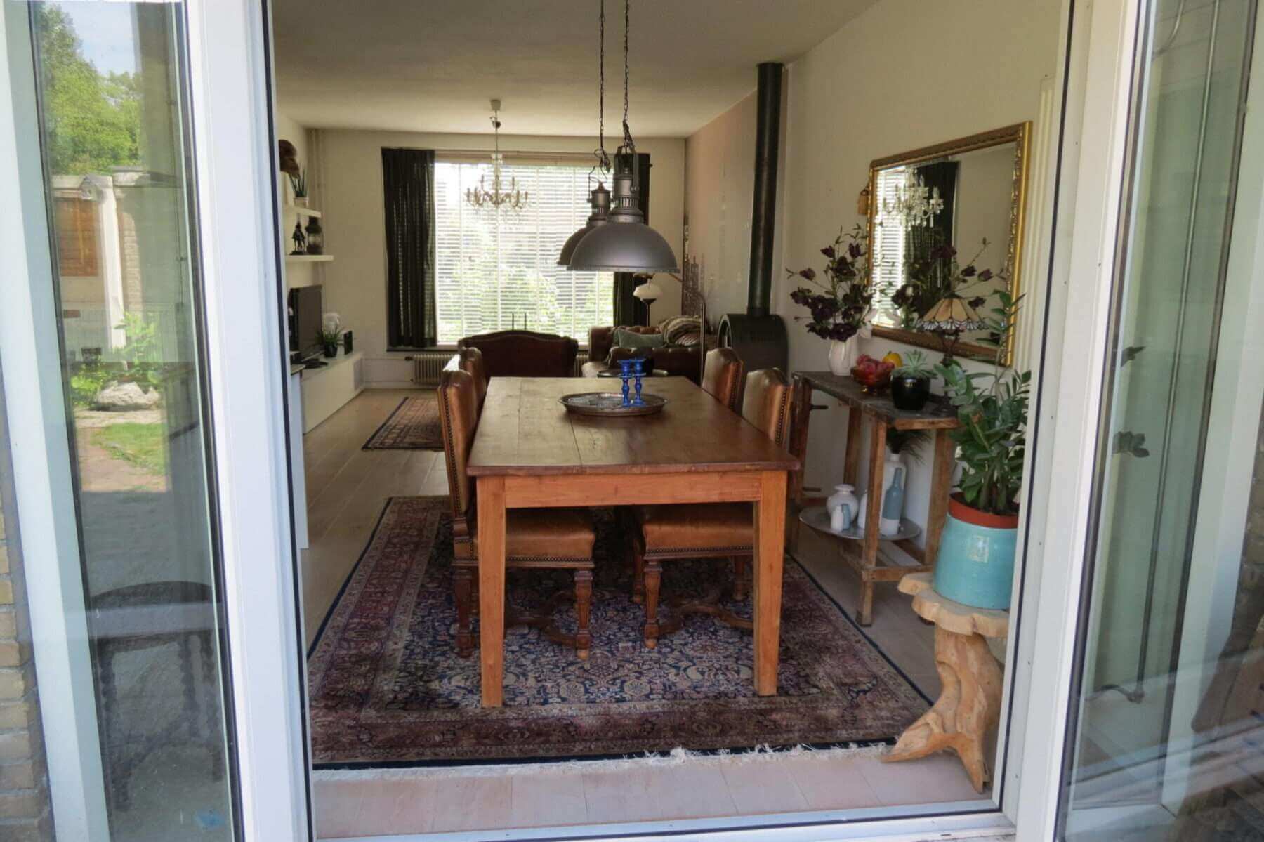 Begane grond; Entree, hal, toilet, meterkast, trap naar boven, toegang tot doorzon woon- en eetkamer met eiken houten vloer en de open keuken met openslaande deuren naar de mooie tuin op het zuiden met carport en achterom. De keuken is voorzien van een kookeiland met composiet werkblad, een 5-pits gasfornuis, een afzuigkap, oven, magnetron, koelkast met inbouwvriezer, vaatwasmachine en heeft zeer vel opbergruimte. De garage die op het terrein staat wordt niet mee verhuurd.