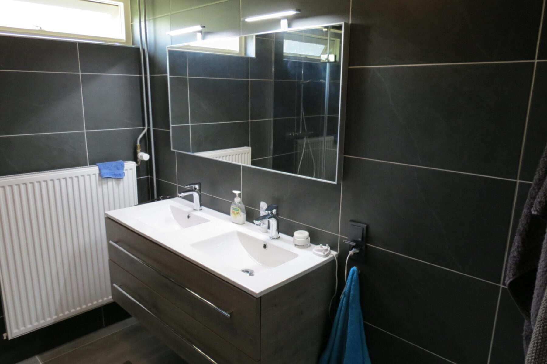 1e verdieping; Overloop, 2 grote slaapkamers (waarvan 1 voorzien van een balkon) en 1 wat kleinere kamer aan de achterzijde. Mooie, moderne badkamer met regendouche, dubbele wastafel en toilet. De eerste verdieping is geheel voorzien van een laminaatvloer.