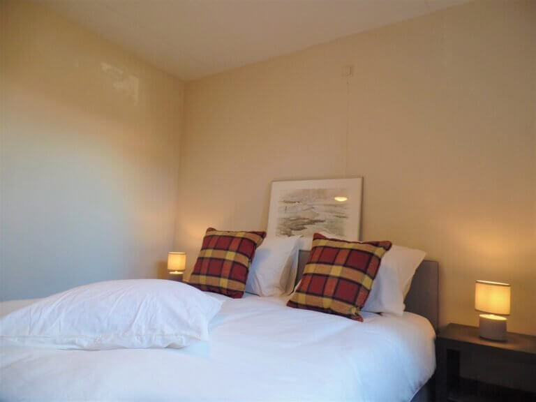 Entree van de woning, hal met combinatie wasmachine droger aansluiting, meterkast en toegang naar de verschillende vertrekken van de woning. Hoofdslaapkamer met tweepersoons boxspring en garderobekast. Badkamer met douchecabine, wastafelmeubel en toilet. Woonkamer met open keuken en schuifpui naar de achtertuin met terras.