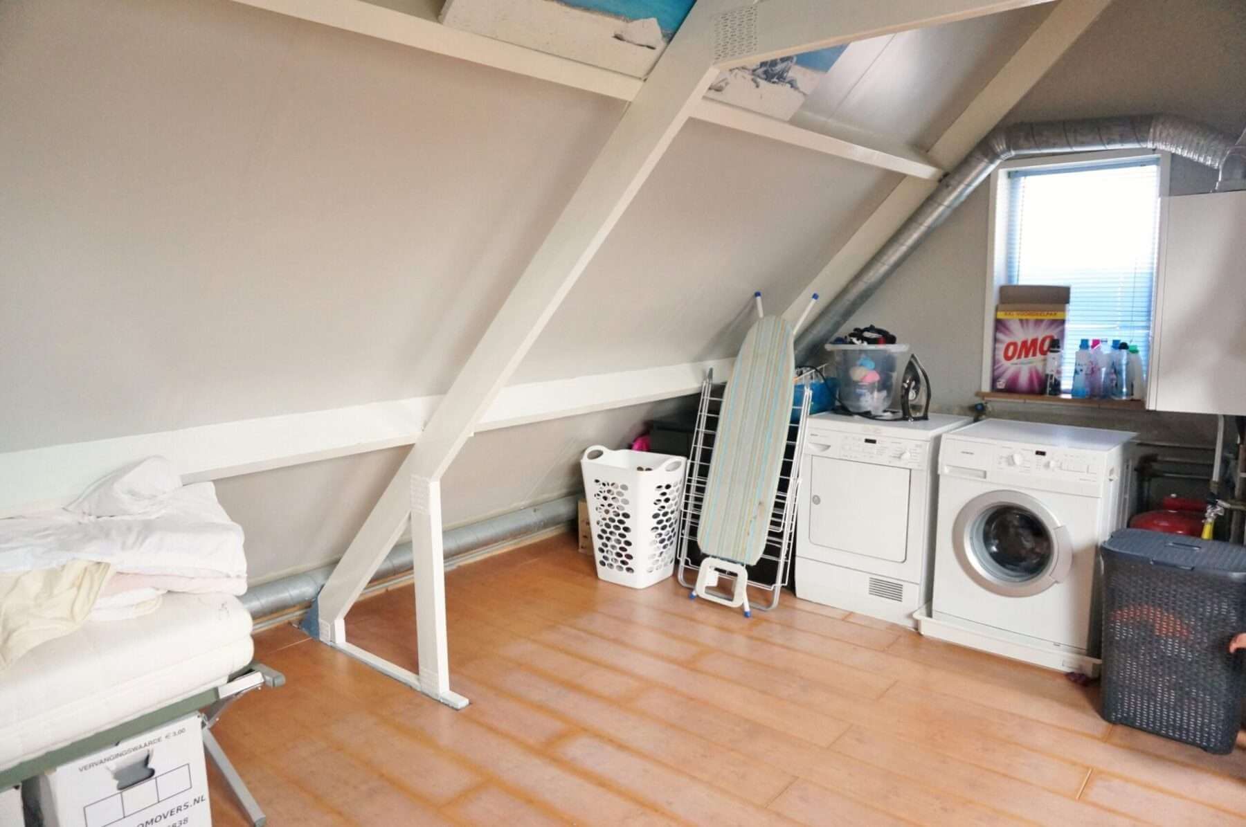Ruime zolder met veel bergruimte , CV installatie en aansluiting voor wasmachine.