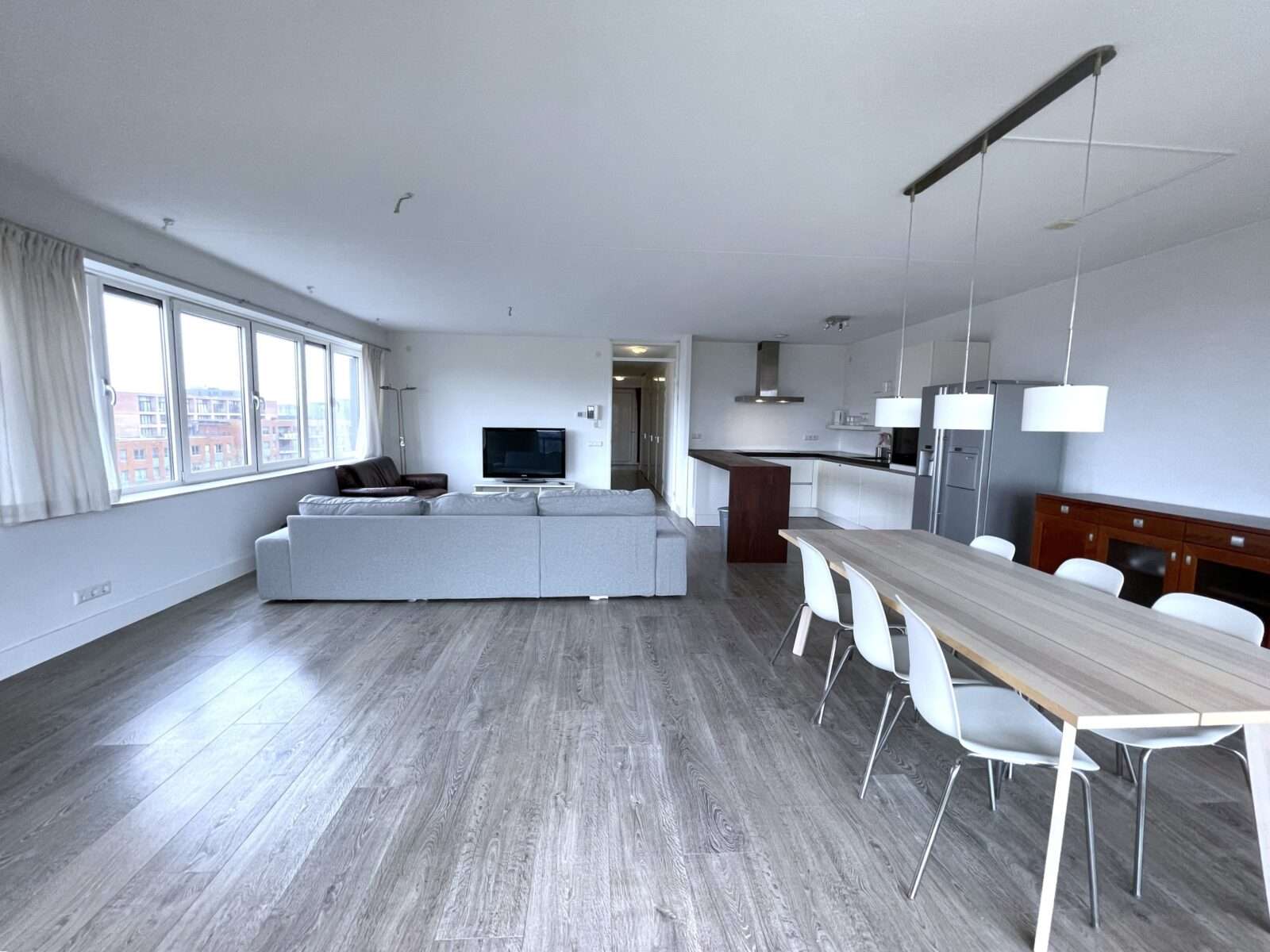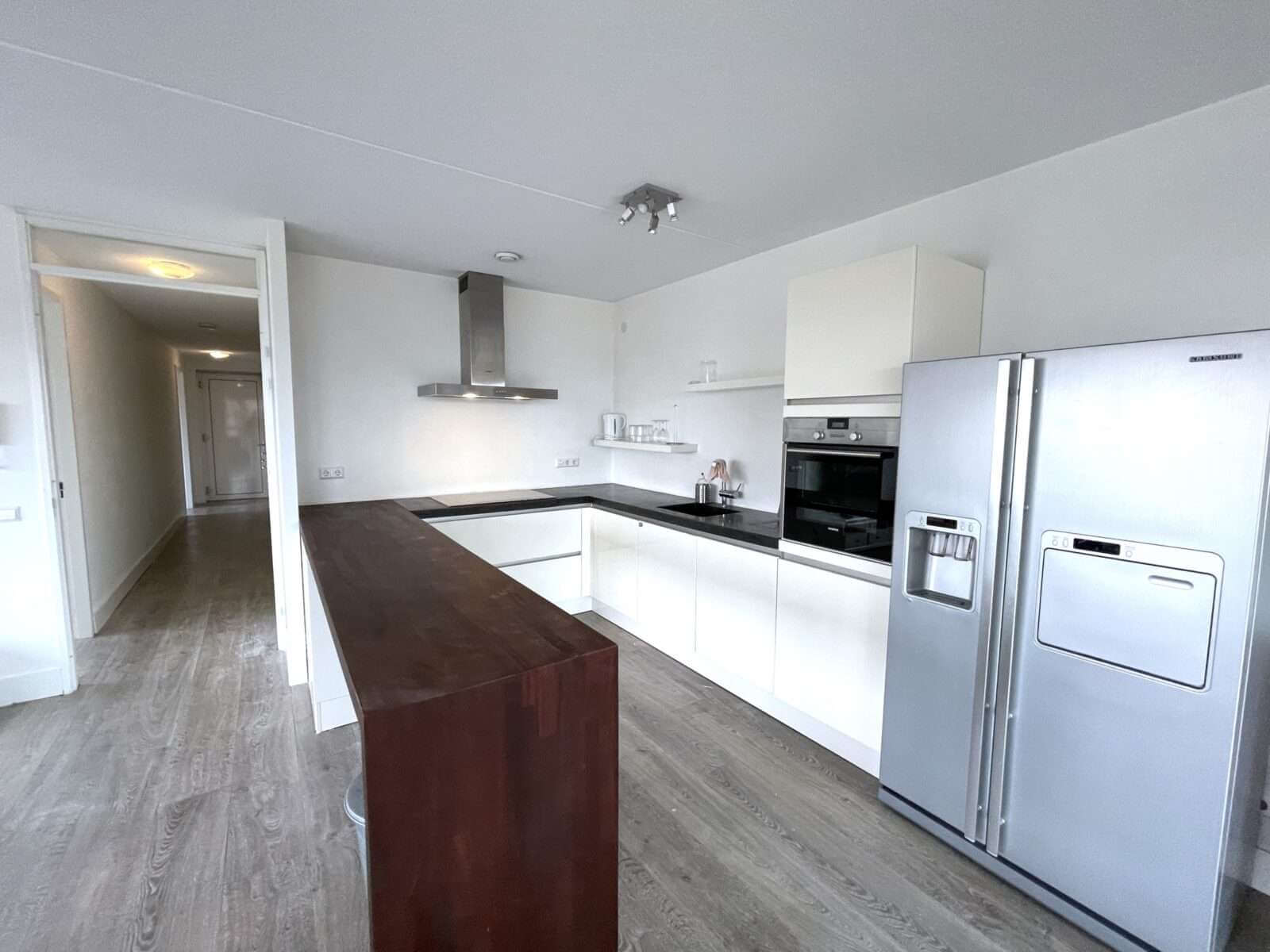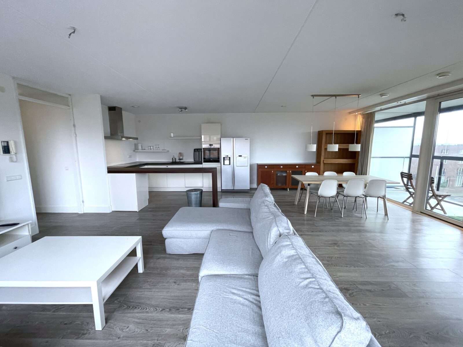 Entree woning, hal met toegang tot alle vertrekken. Zeer ruime woonkamer van ruim 50m² met veel lichtinval en aansluitend een heerlijk balkon van maar liefst 7 meter breed, met de middag/avondzon.