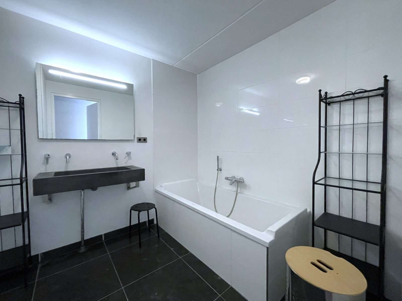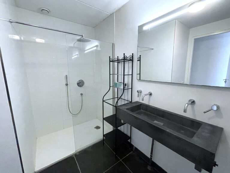 Badkamer met bad, douche en wastafel, er zijn luxe materialen gebruikt. Twee ruime slaapkamers.