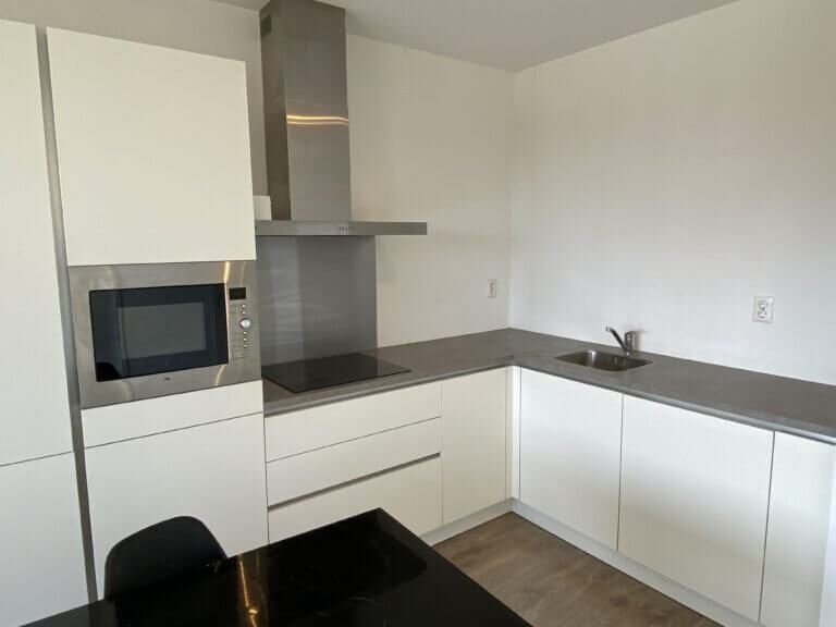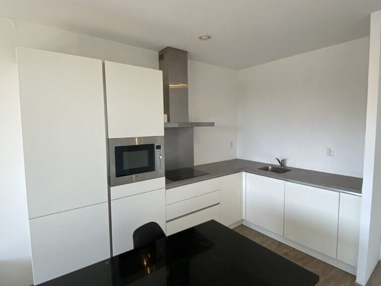 Via de hal kom je binnen in de ruime woonkamer welke door middel van openslaande deuren grenst aan het heerlijk ruime balkon. Het eetgedeelte met open keuken is voorzien van alle luxe inbouwapparatuur zoals een inductiekookplaat met afzuigkap, een vaatwasser, oven magnetron en een grote koel-vriescombinatie.