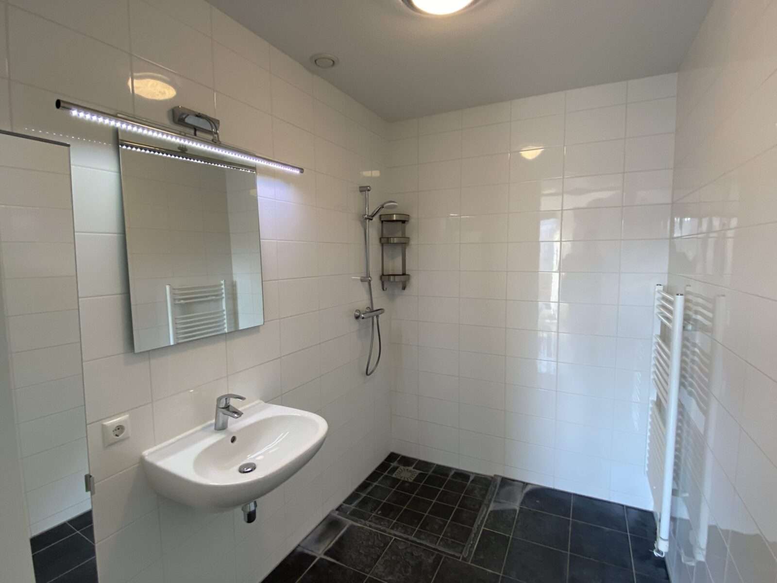 De slaapkamer met luxe boxspring geeft direct toegang tot de badkamer. Deze is uitgerust met een open douche, wastafel en designradiator.