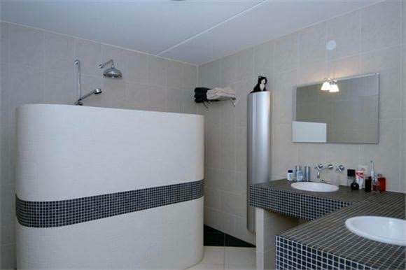 Ruime en geheel betegelde badkamer (3.00 x 3.21m) voorzien van dubbele wastafel, royale inloopdouche en design radiator.