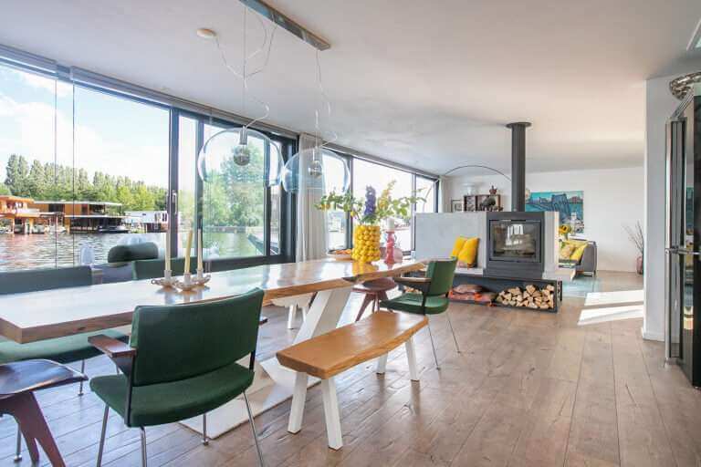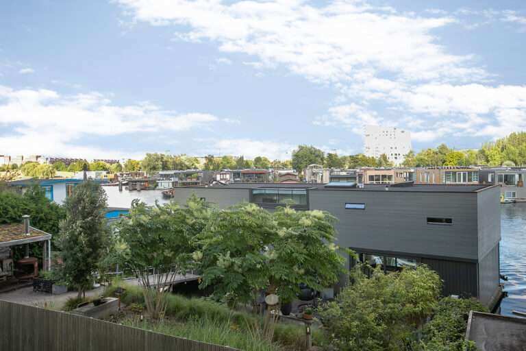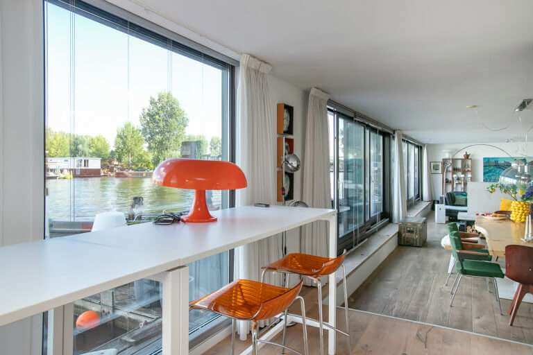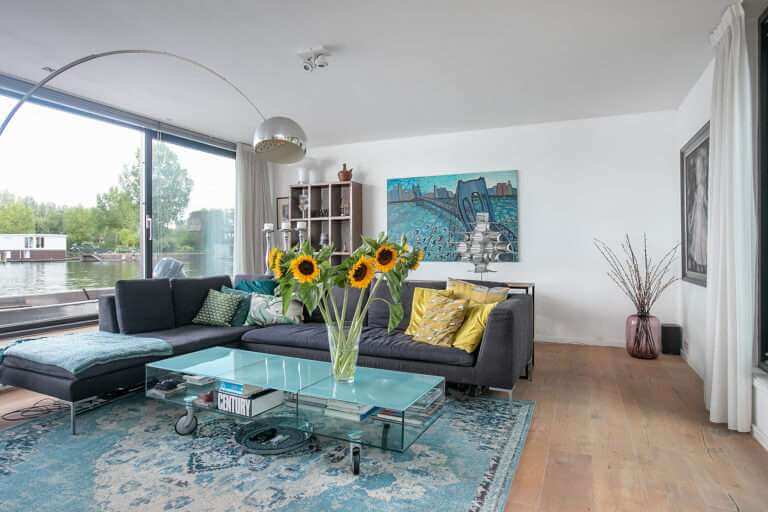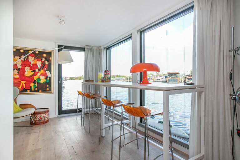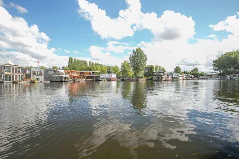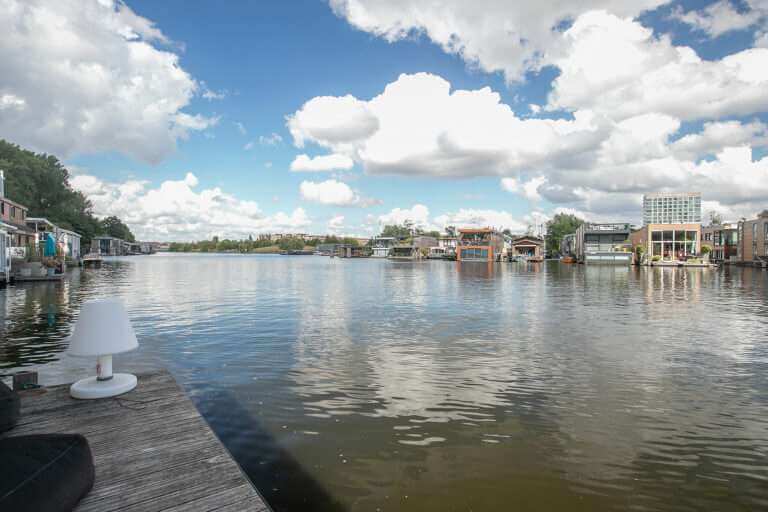 Het uitzicht over de Schinkel is fenomenaal. Met een plezierboot bent u binnen een paar minuten bij de boten sluis, die toegang biedt tot de Nieuwe Meer met de vele recreatiegelegenheden. Als je de andere richting op vaart, dan bevind je binnen een mum van tijd in het centrum van Amsterdam.