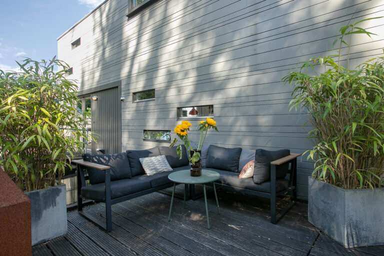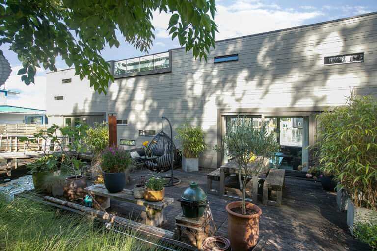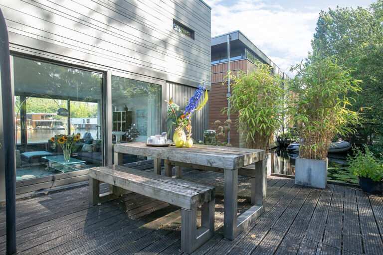 – De woning heeft meerdere buitenterrassen op het land èn in het water
