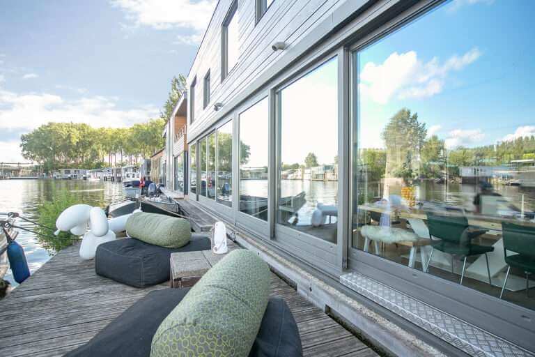 Er wordt gezwommen, gesupt, geroeid, gekanood en natuurlijk gevaren. Je voelt je hier één met water en met het weer, door onder andere de grote schuifpuien aan de waterkant.