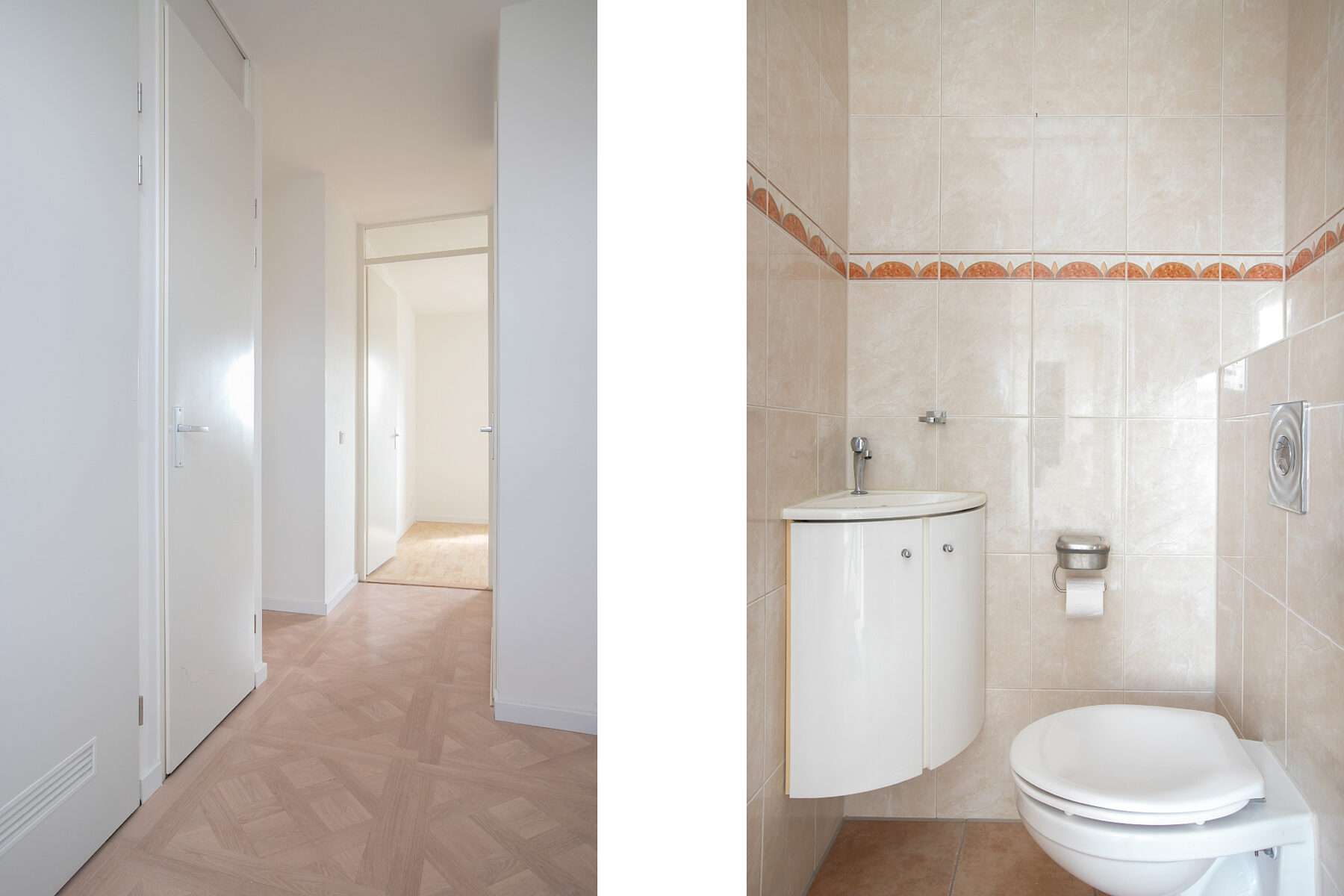 De hal en woonkamer zijn voorzien van speciaal gelegd parket. De volledige woning is voorzien van strak gestucte muren en plafonds.