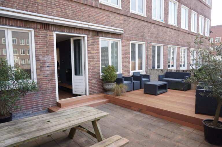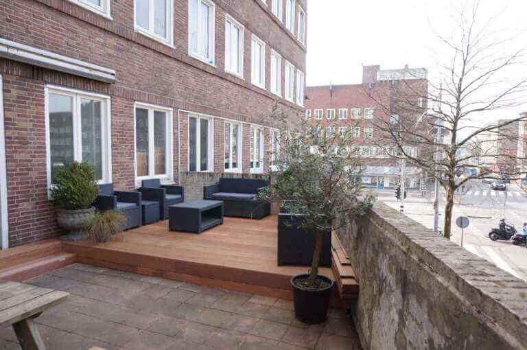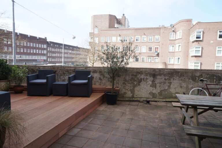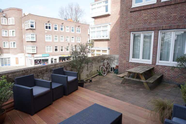 De woning beschikt over een met balkon (oost) grenzend aan de slaapkamers en een groot terras (west) grenzend aan de woonkamer.