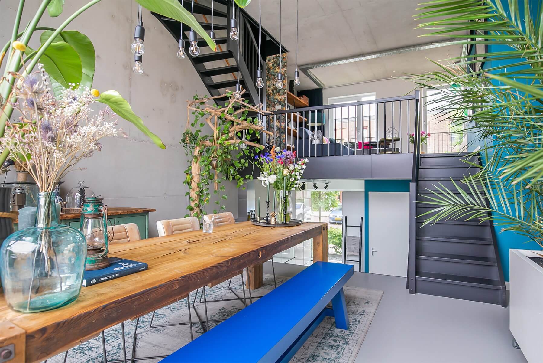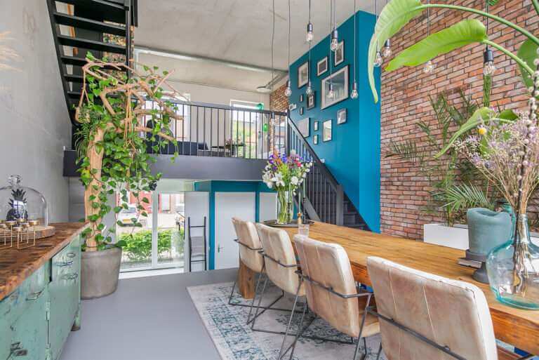 Middels een trap bereikt u de eetkamer met openslaande deuren, welke gesitueerd is op de 1e verdieping aan de achterzijde van de woning, deze prachtige hoge ruimte grenst aan de achtertuin.