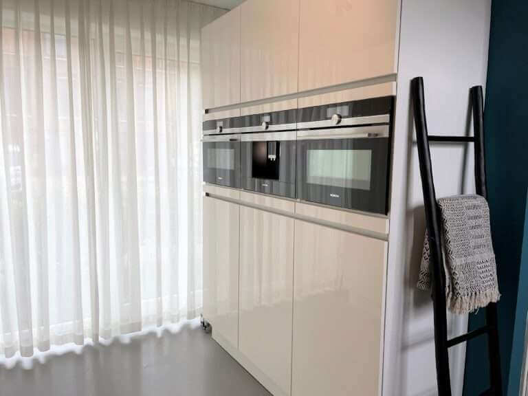 De keuken met grote vriezer en grote koelkast, combi magnetron oven, stoom oven, inbouw koffie automaat, cooker en vaatwasser, is evenals de badkamer op maat gemaakt.