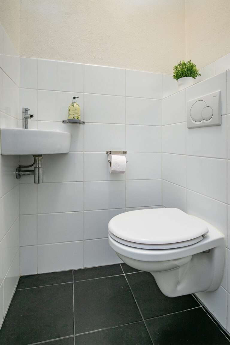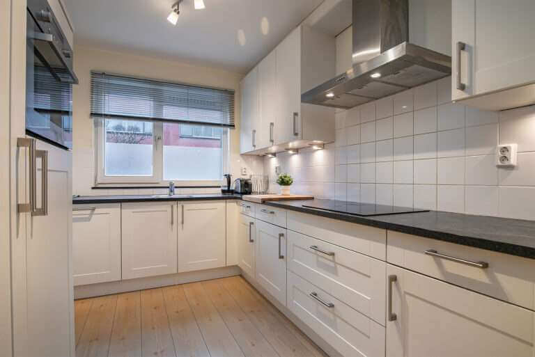 Entree, hal met toegang tot meterkast, gastentoilet met fonteintje en grote woonkamer (40 m2) met moderne open keuken, voorzien van diverse luxe inbouwapparatuur, zoals combinatie oven magnetron, 4 pits keramische kookplaat, koelvriescombinatie, afzuigkap en spoelbak. In de woonkamer is onder de trap een ruime provisiekast aanwezig. Vanuit de woonkamer bereikt via de grote schuifpui de ruime achtertuin met berging en achterom.