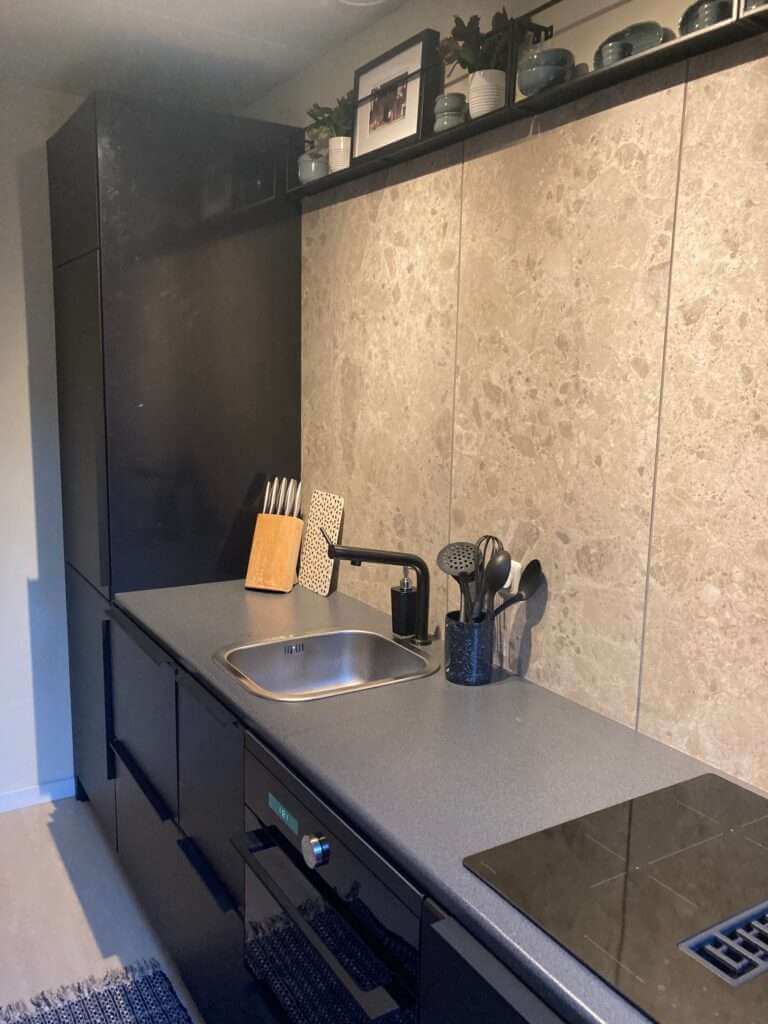 – Het appartement wordt voorzien van een moderne nieuwe zwarte keuken met inbouwapparatuur;