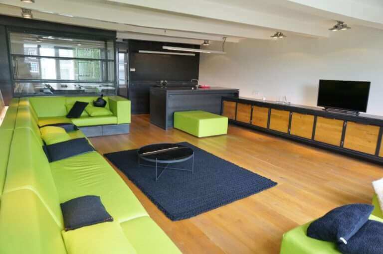 De grote woonkamer/leefkeuken met raampartijen aan de grachtzijde, een open keuken en een aparte eetkamer met daglicht bevinden zich op de derde verdieping. Tevens bevindt zich hier een badkamer met douche, dubbele wastafel en toilet.