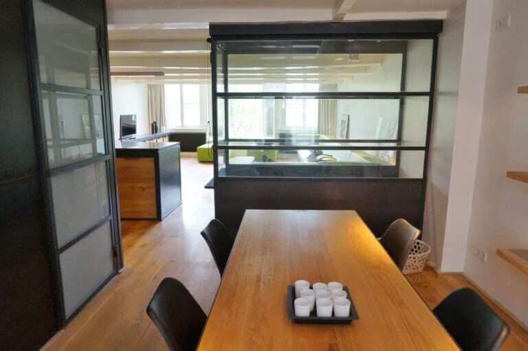 Bij binnenkomst betreedt u de statige hal met aan de linkerzijde toegang tot de lift en aan het einde van de hal bevindt zich de brede trap.
