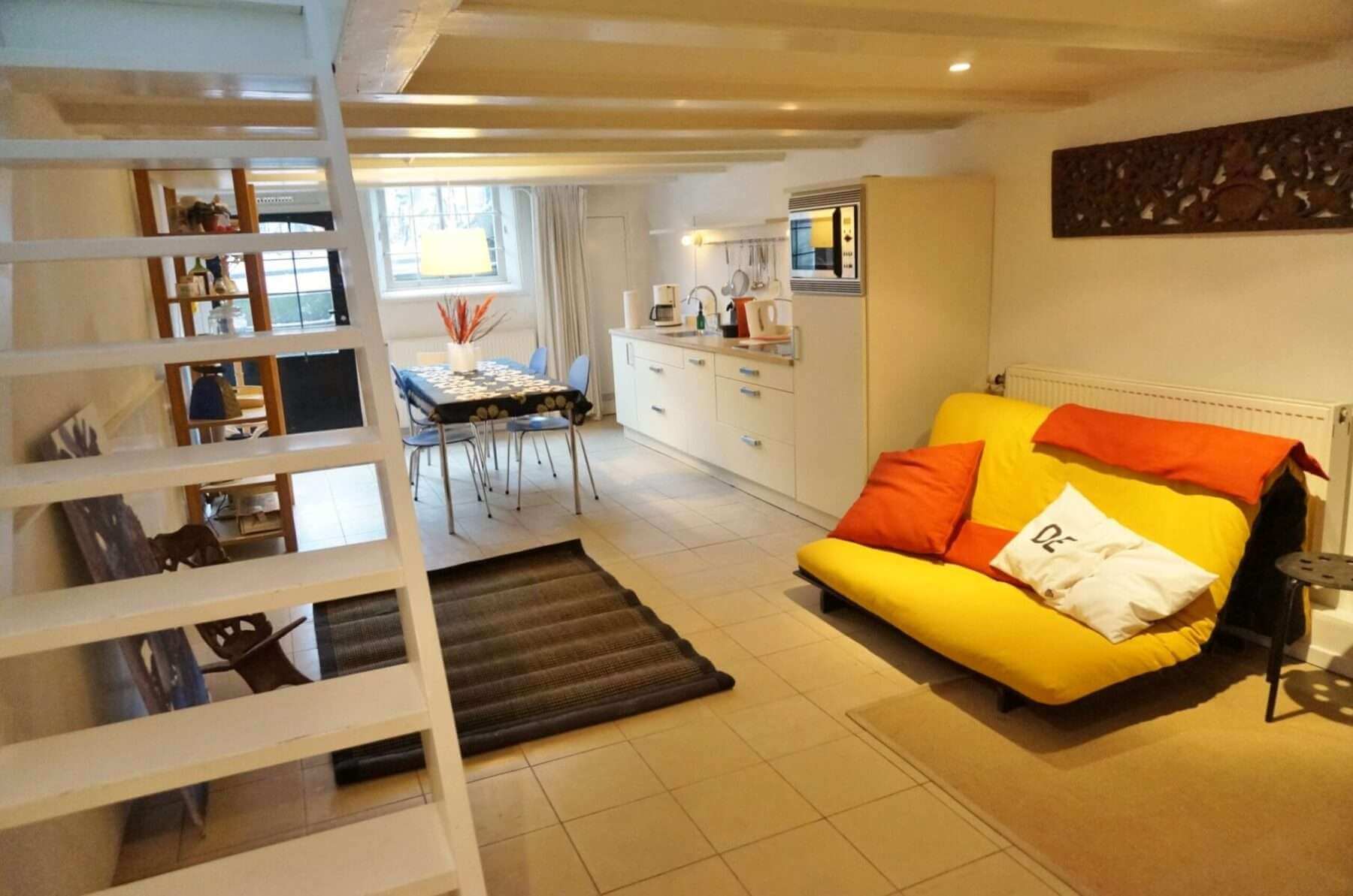 Vanuit de woonkamer kijkt u uit op het water van de gracht, de open slaapkamer bevindt zich aan de achterzijde van de woning.